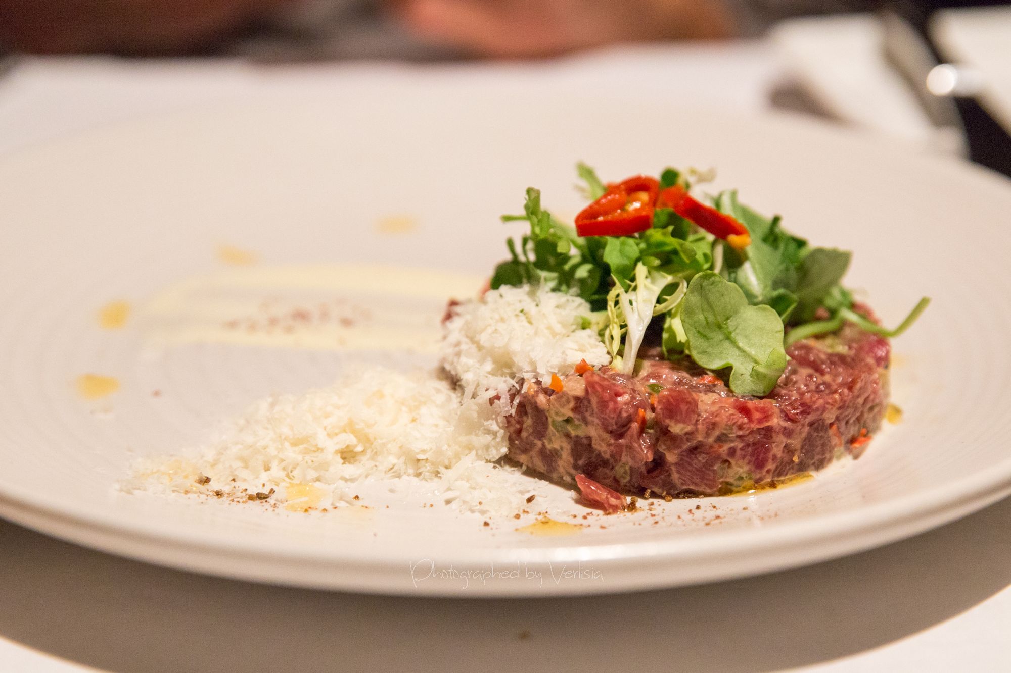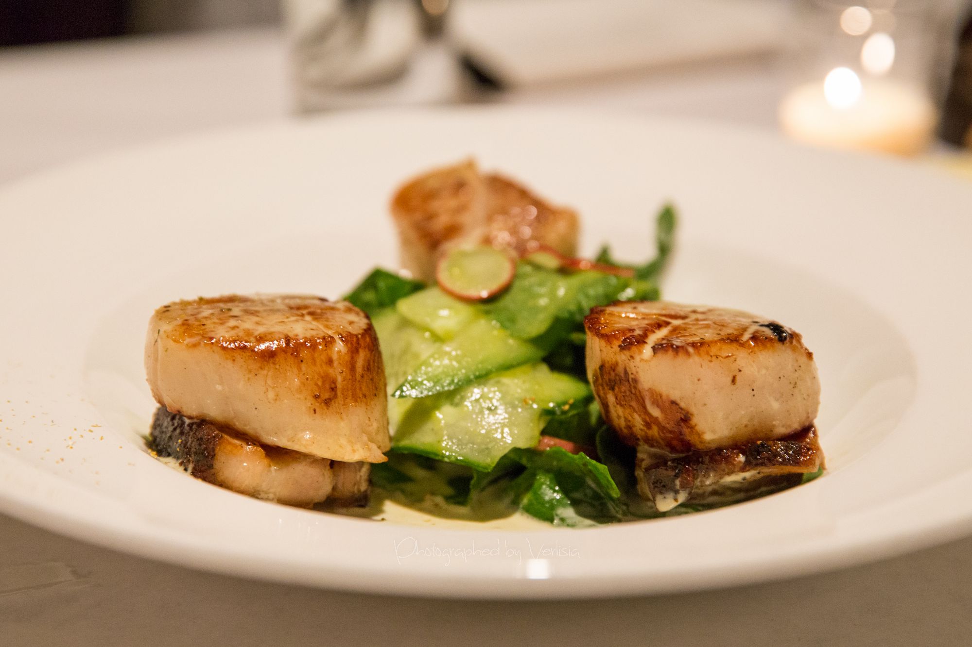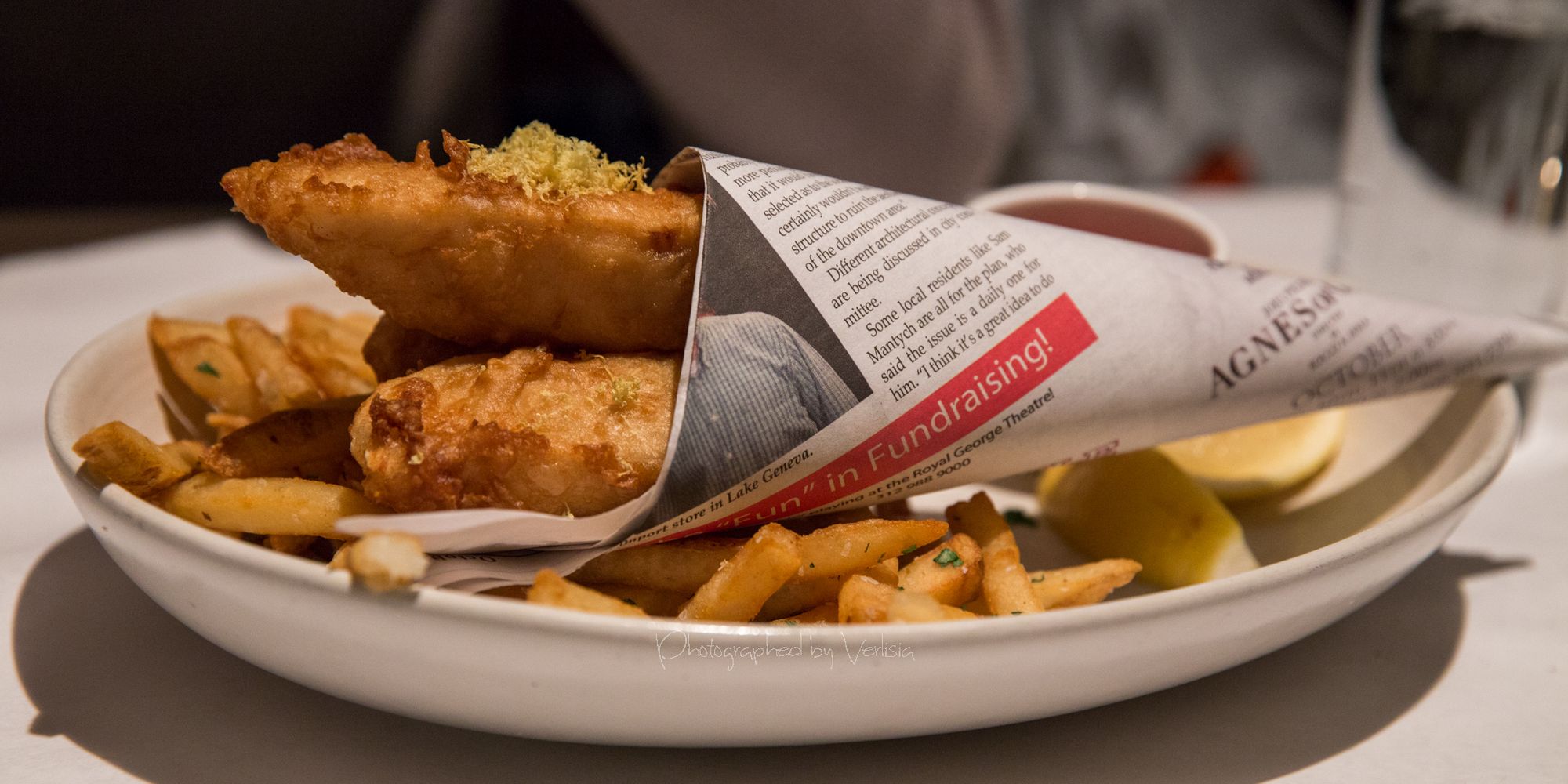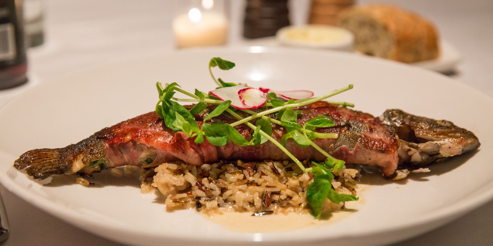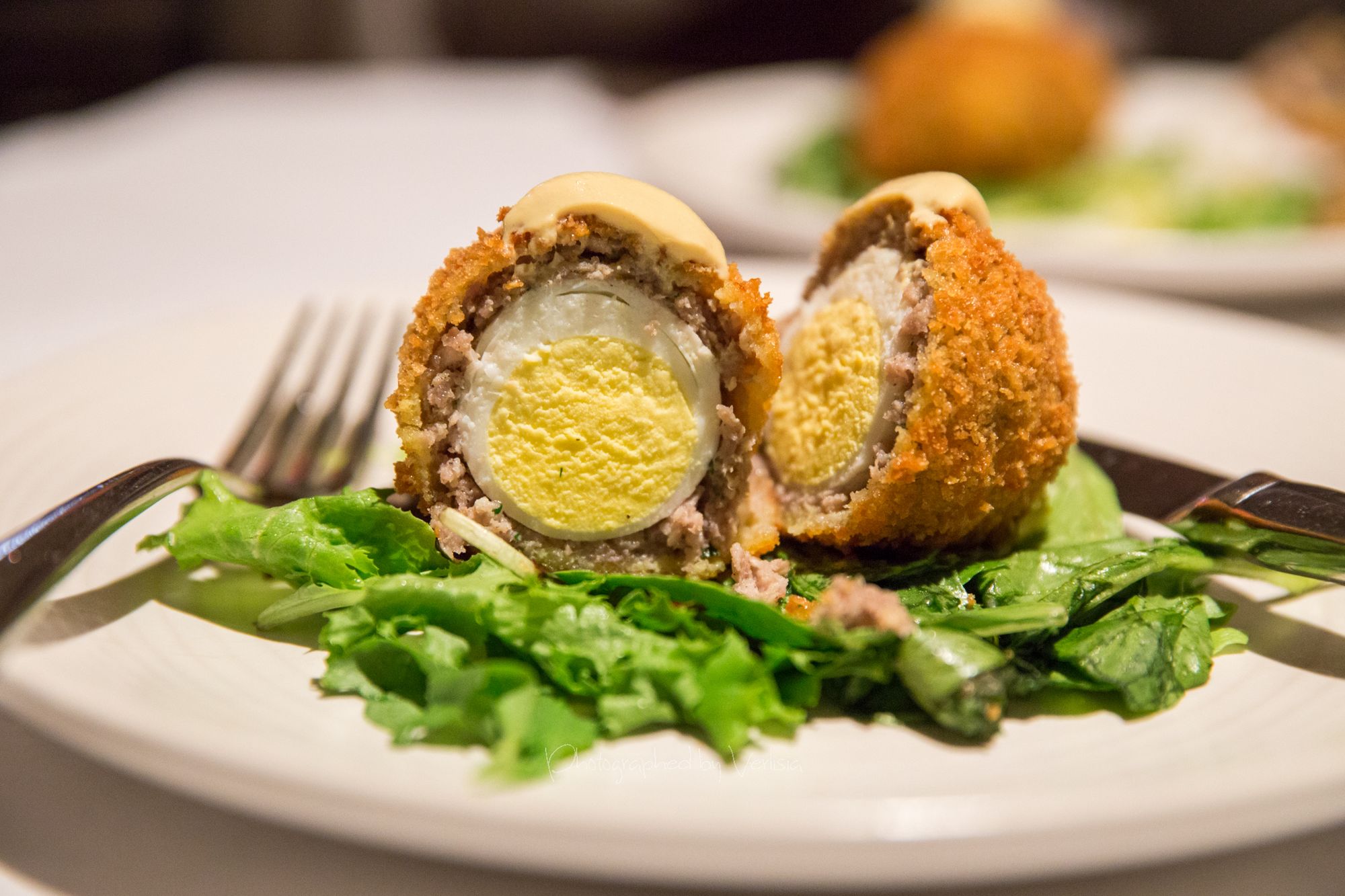 Bread and Butter, Scotch EggSeared Nantucket Sea Scallops (smoked pork belly, fennel buerre blanc, pea tendrils, local cucumber), Bison TartareToast, Acanto's Daily Pasta - PenneWhole Idaho Rainbow Trout (wild rice, sultanas, prosciutto, apple buerre blanc), Fish and Chips (Guinnes batter, malt tartar sauce, lemon)