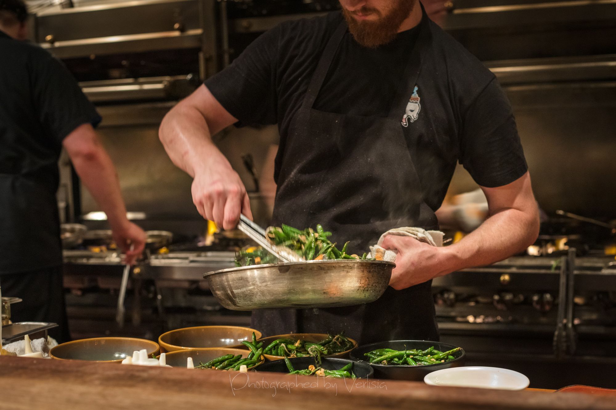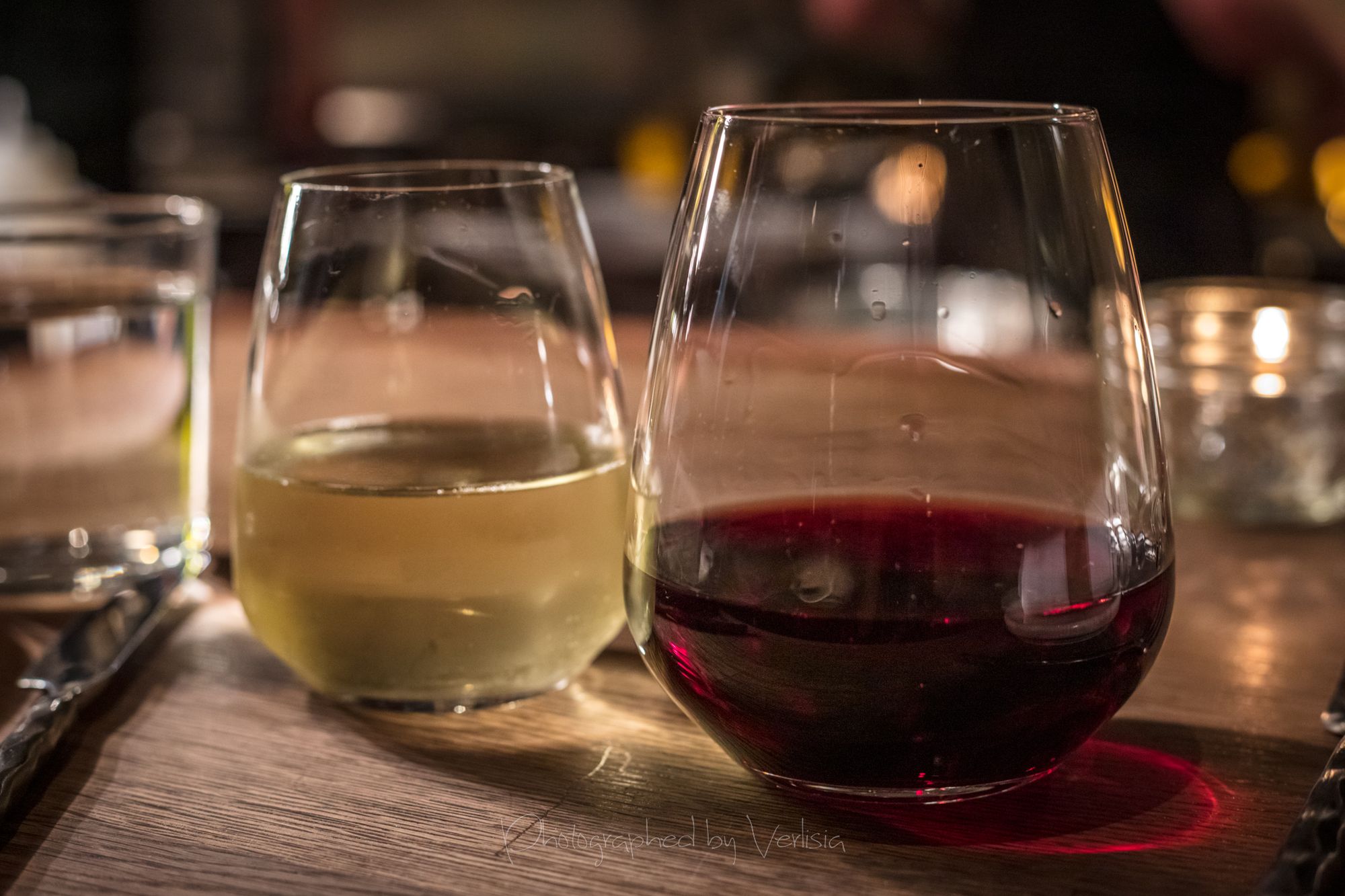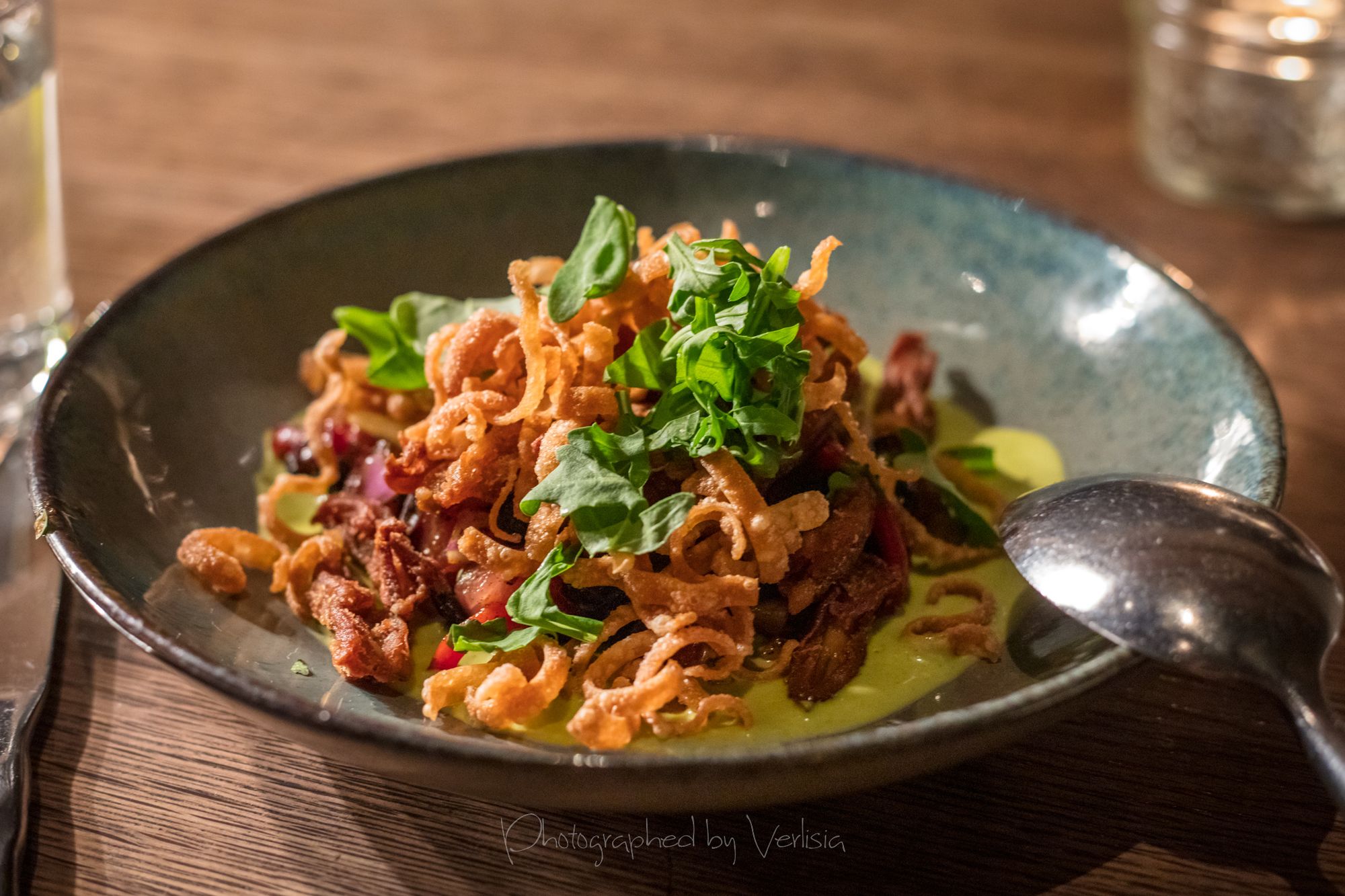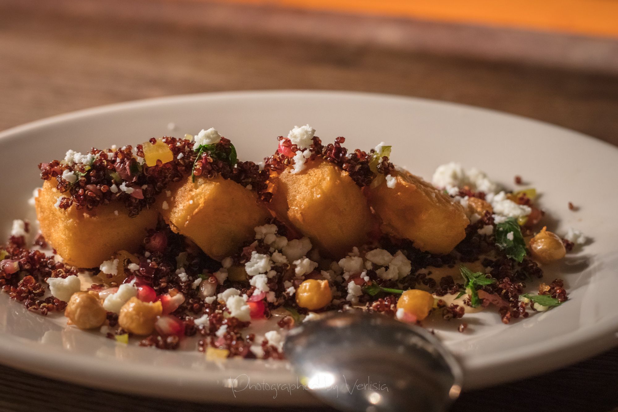 Wine, Duck Tongues (tuna and black bean poke. piri piri), goat carpaccio (smoked trout roe. olive-maple vinaigrette)Chickpea Fritter (whipped feta. heirloom tomato. stone fruit. nicoise olives), escargot ravioli (bacon tamarind sauce. escarole and celery. crispy onions)wood oven roasted pig face (sunny side egg, tamarind. cilantro. red wine-maple. potato stix.)caramel corn & malt balls (vanilla malt gelato. popcorn caramel. chocolate magic shell.)