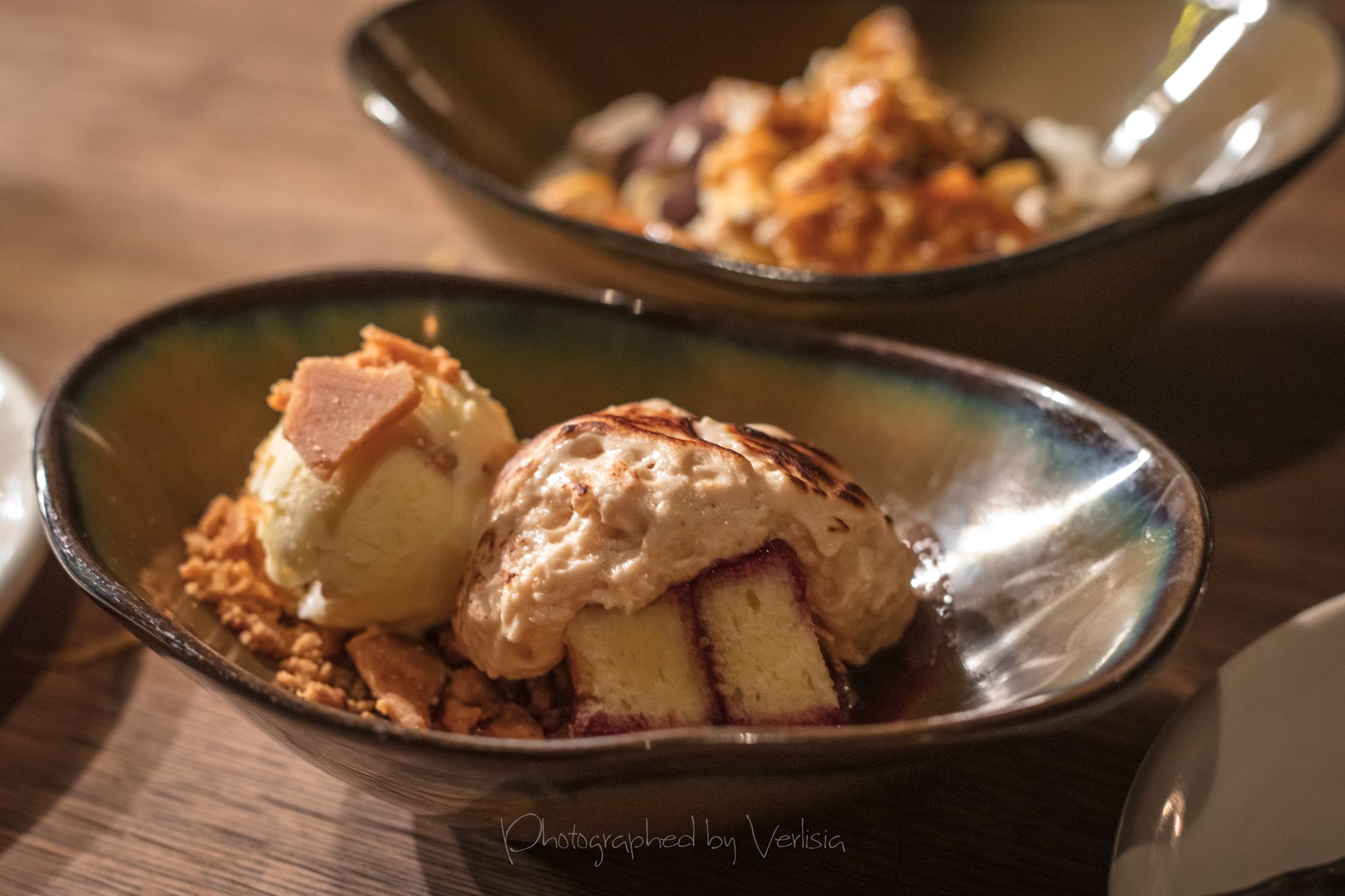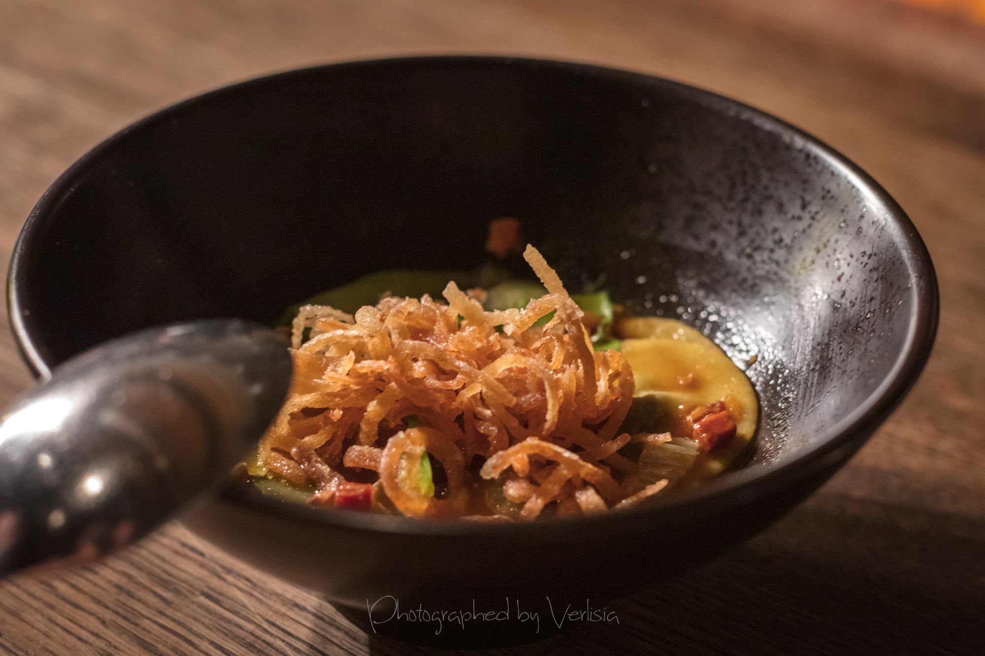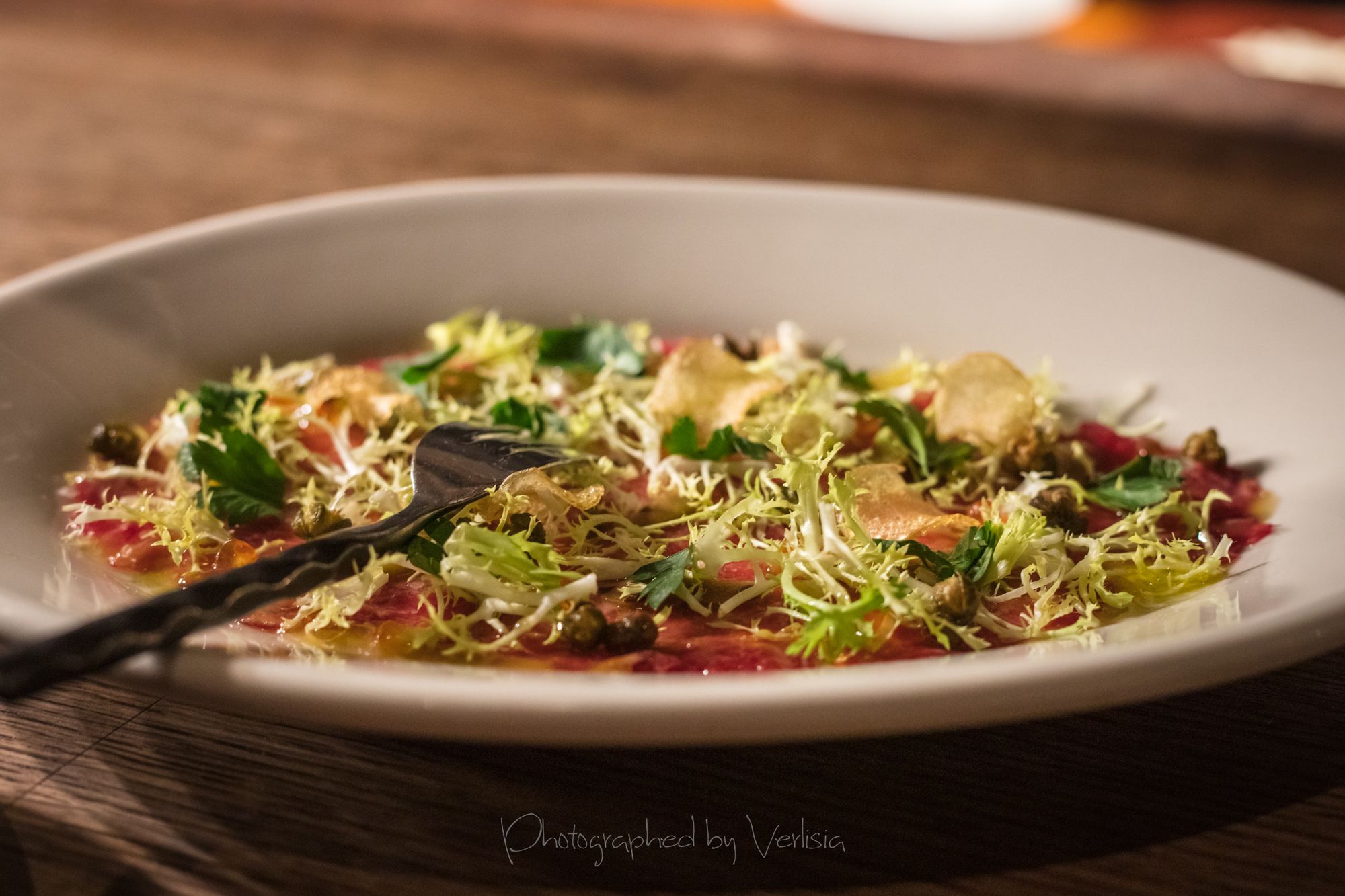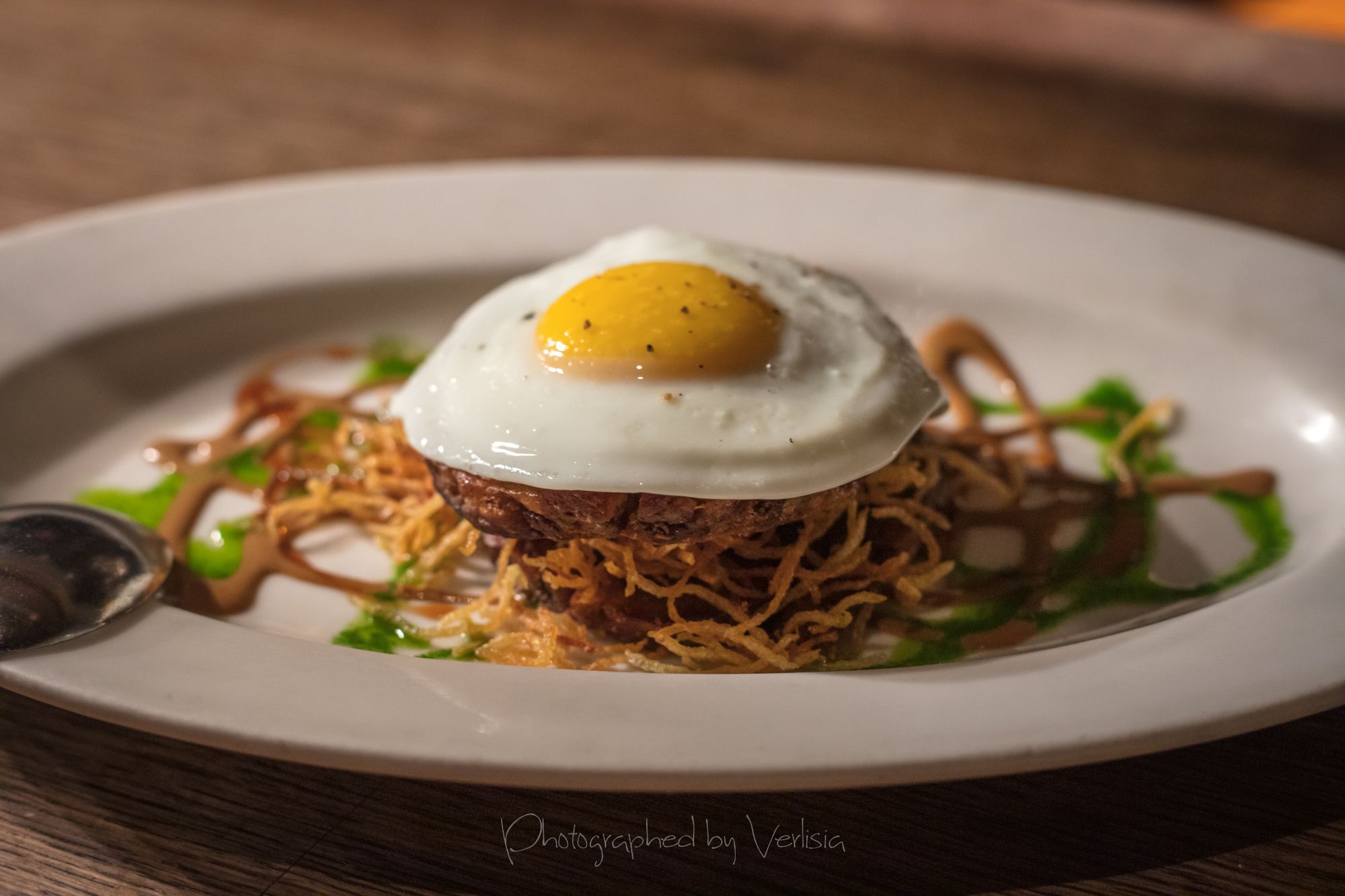 Wine, Duck Tongues (tuna and black bean poke. piri piri), goat carpaccio (smoked trout roe. olive-maple vinaigrette)Chickpea Fritter (whipped feta. heirloom tomato. stone fruit. nicoise olives), escargot ravioli (bacon tamarind sauce. escarole and celery. crispy onions)wood oven roasted pig face (sunny side egg, tamarind. cilantro. red wine-maple. potato stix.)caramel corn & malt balls (vanilla malt gelato. popcorn caramel. chocolate magic shell.)