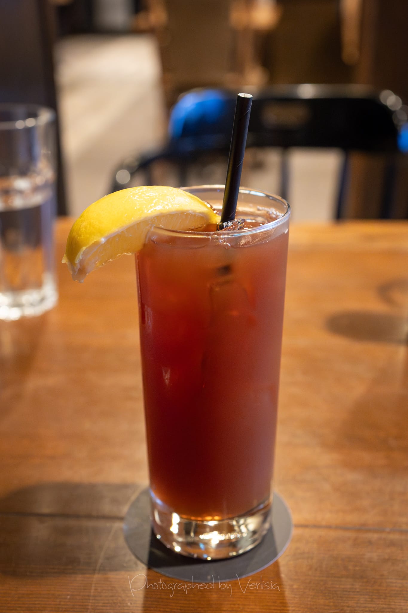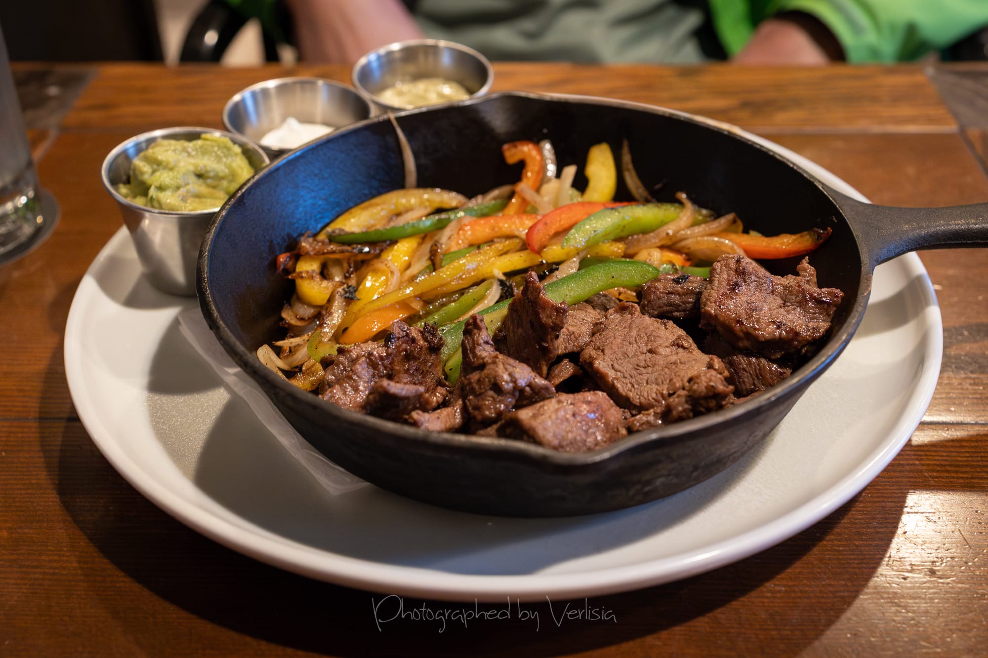 Outpost Iced Tea (Peach Infused Ice Team, Buffalo Trace Bourbon, Unsweetened); Fajitas (Marinated flat iron steak, sauteed onions, bell peppers, salsa verde, sour cream, corn tortillas)