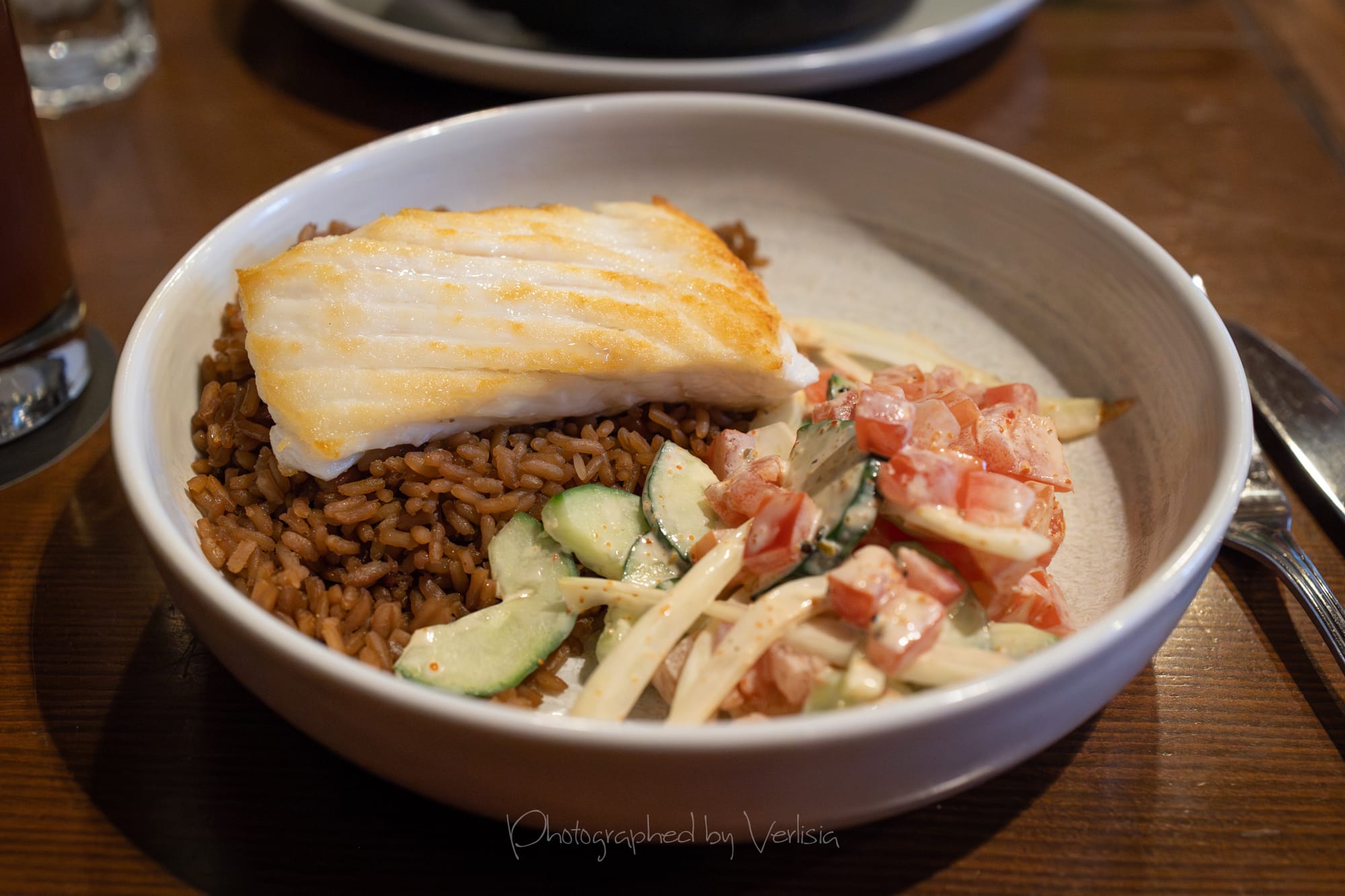 Crispy Fried Halibut Filler (coconut rice, tomatoes, cucumber & fennel salad, yuzu lemon dressing); Zero Proof Raspberry Mojito