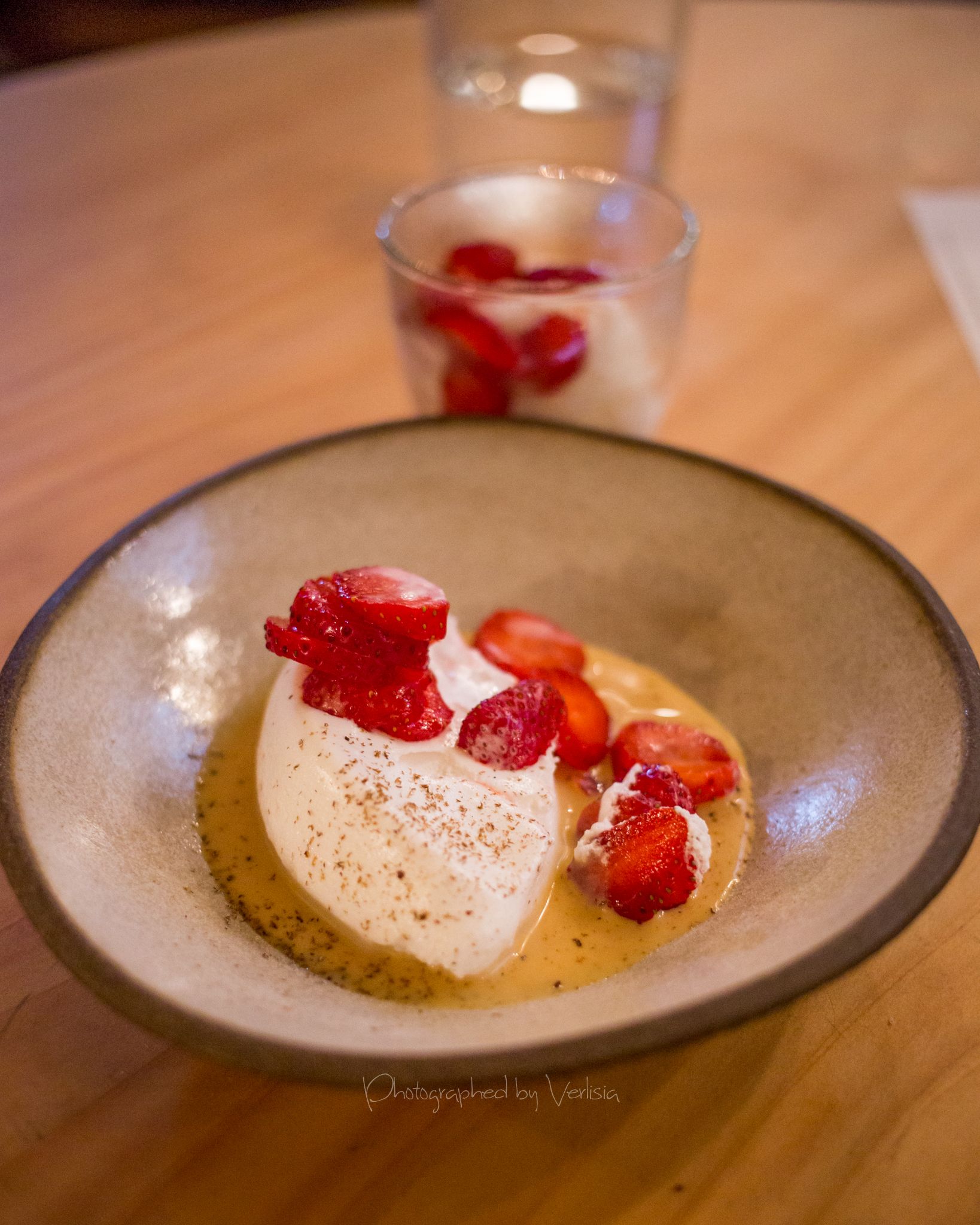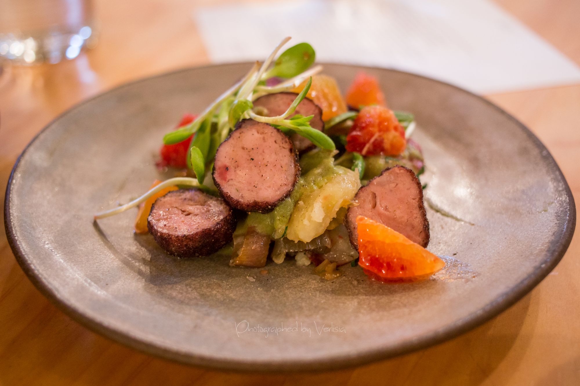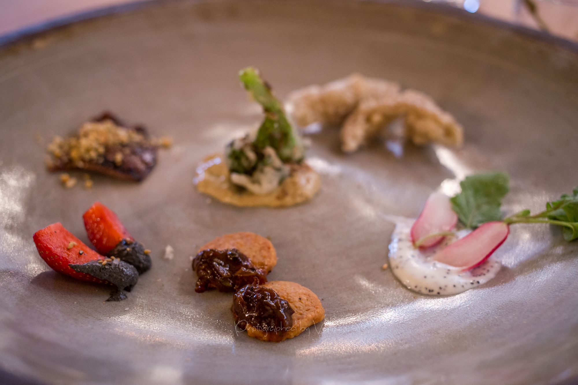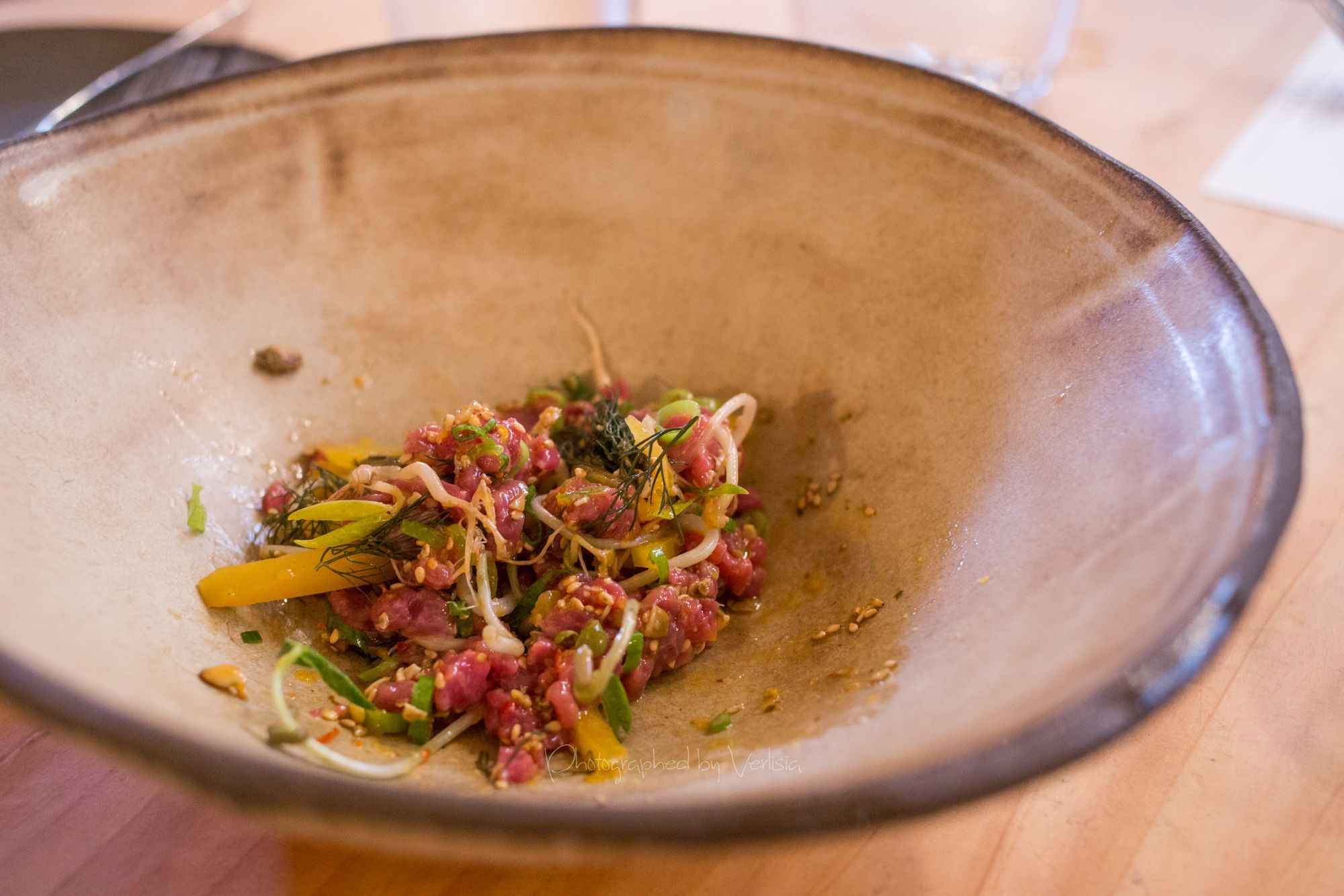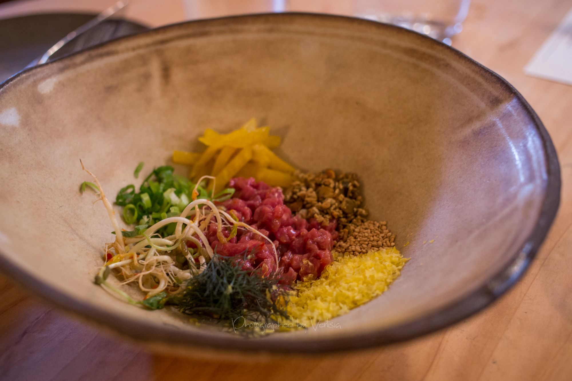 Amuse Bouche, The Tap Twice (gin, rye, lemon. honey, jasmine emulsion orange bitters)spiced lamb tartare with various 'mix-in' condiments and sesame crackersshaved cauliflower herbs & pig fries, 'treasure chest' of fermented sausage (trout quenelles & sweet onion-rice dumpling in a 'creamy' pork broth), smoked & grilled artichokes with quinoa & shaved pig's headpolpette of rabbit & pork with blood orange & castelvetranos, maitake, tofu & bok choy 'stir fry' with smoked block cod ponzusesame & almond tarta (houjicha cream, kumquarts & cherries), salted caramel floating island (coconut-cremem fraiche sherbet, strawberries)