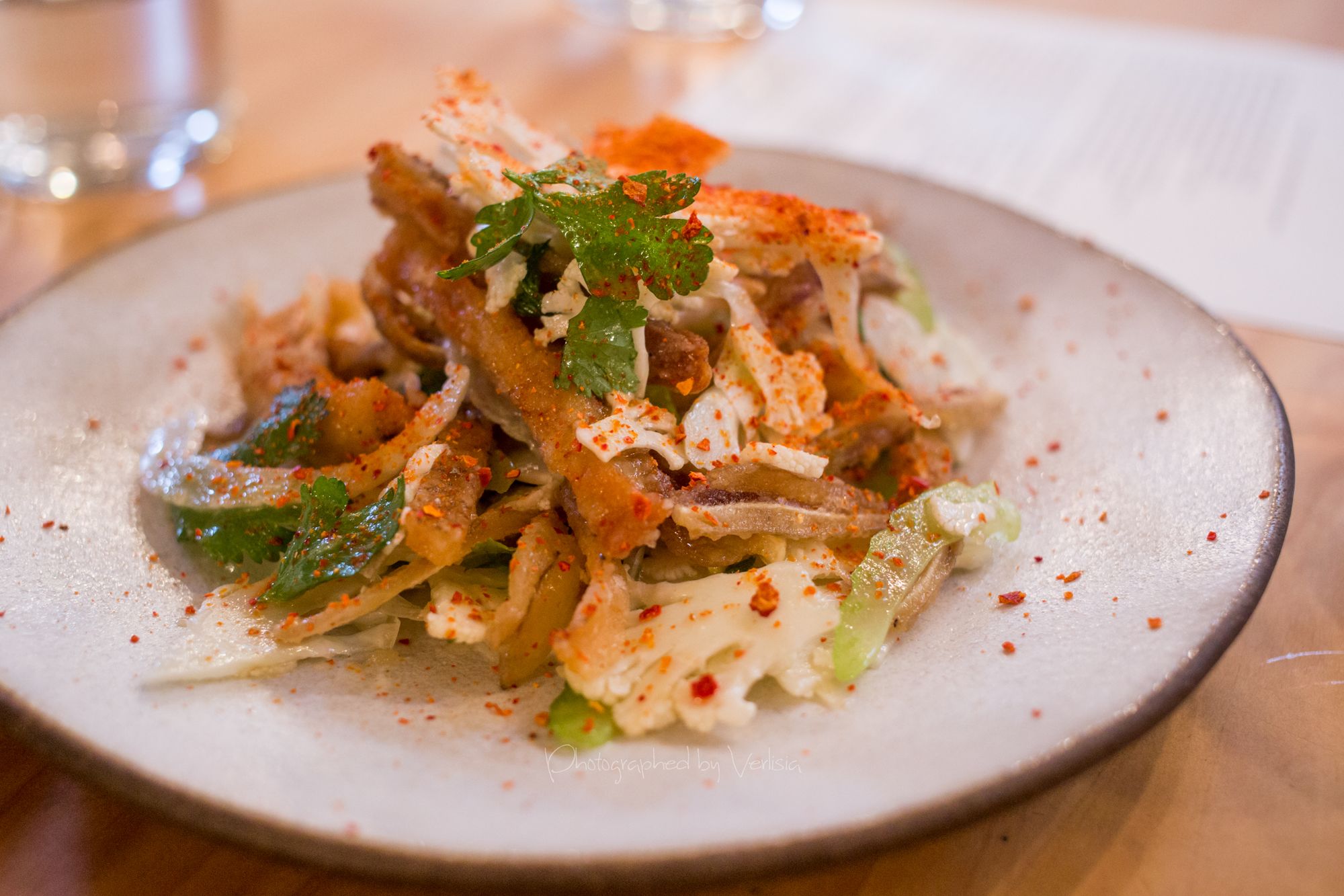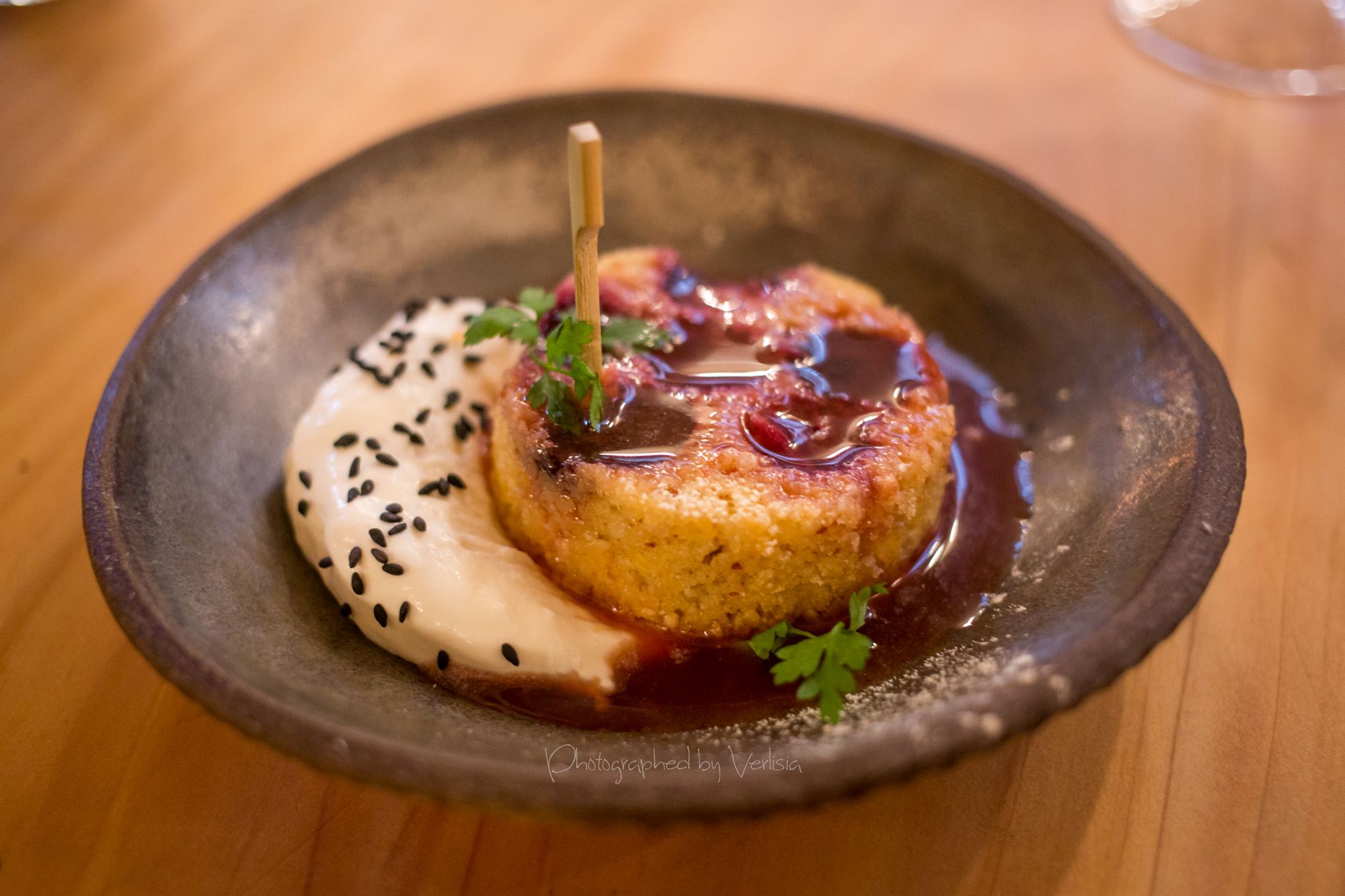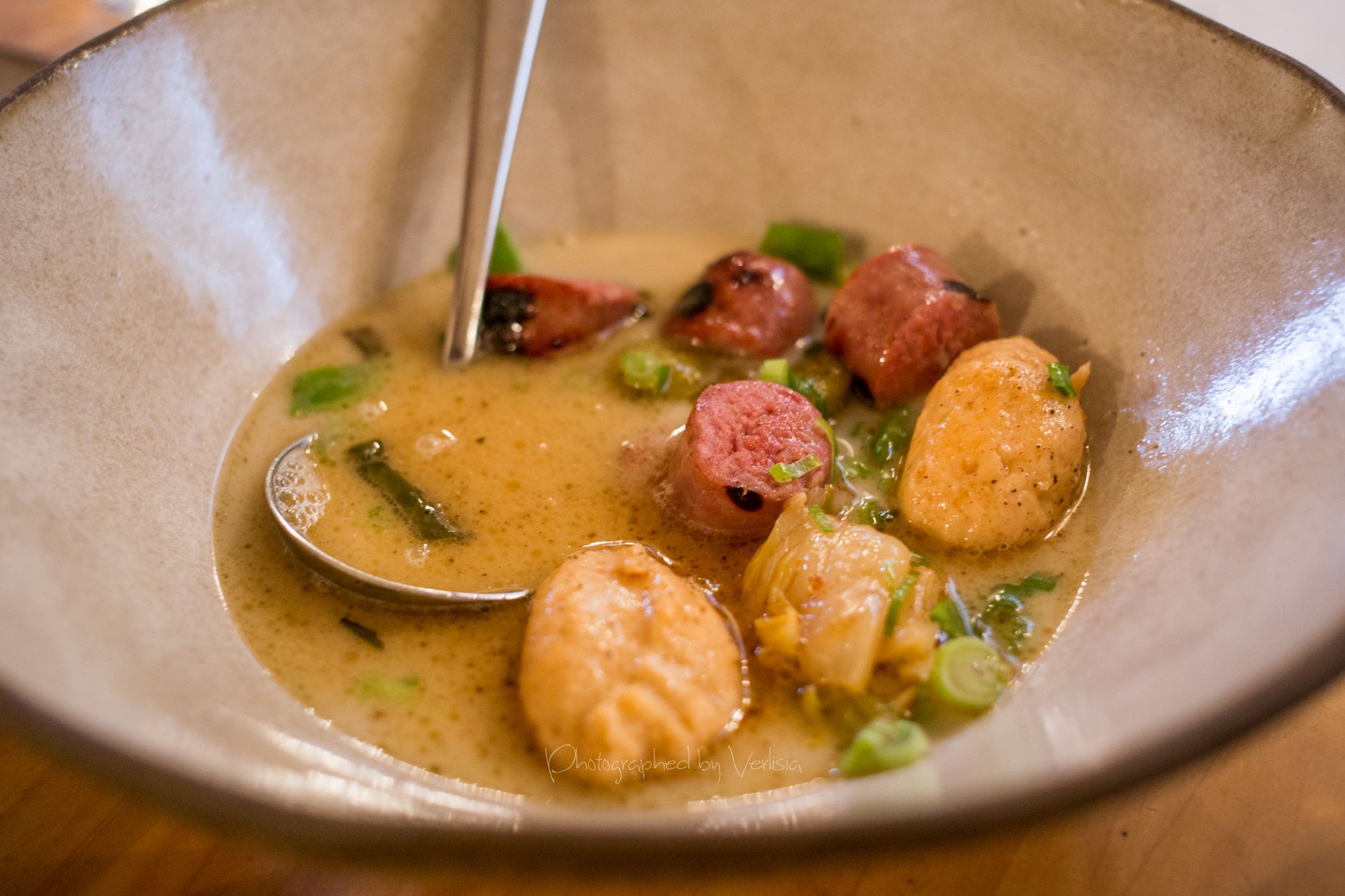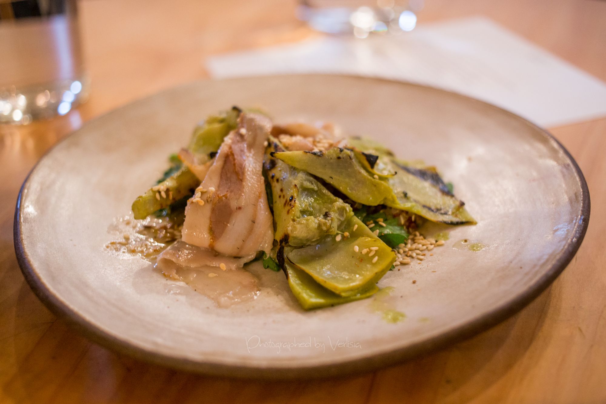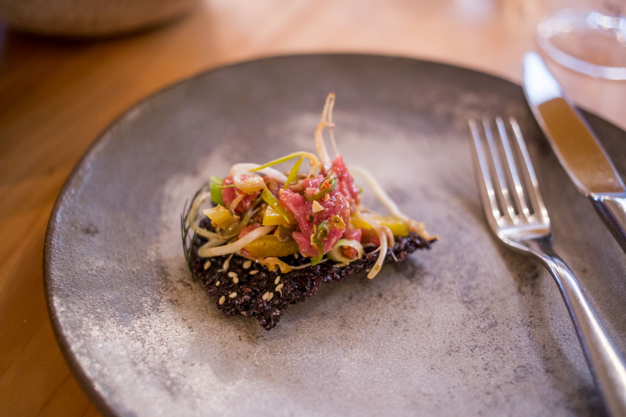 Amuse Bouche, The Tap Twice (gin, rye, lemon. honey, jasmine emulsion orange bitters)spiced lamb tartare with various 'mix-in' condiments and sesame crackersshaved cauliflower herbs & pig fries, 'treasure chest' of fermented sausage (trout quenelles & sweet onion-rice dumpling in a 'creamy' pork broth), smoked & grilled artichokes with quinoa & shaved pig's headpolpette of rabbit & pork with blood orange & castelvetranos, maitake, tofu & bok choy 'stir fry' with smoked block cod ponzusesame & almond tarta (houjicha cream, kumquarts & cherries), salted caramel floating island (coconut-cremem fraiche sherbet, strawberries)