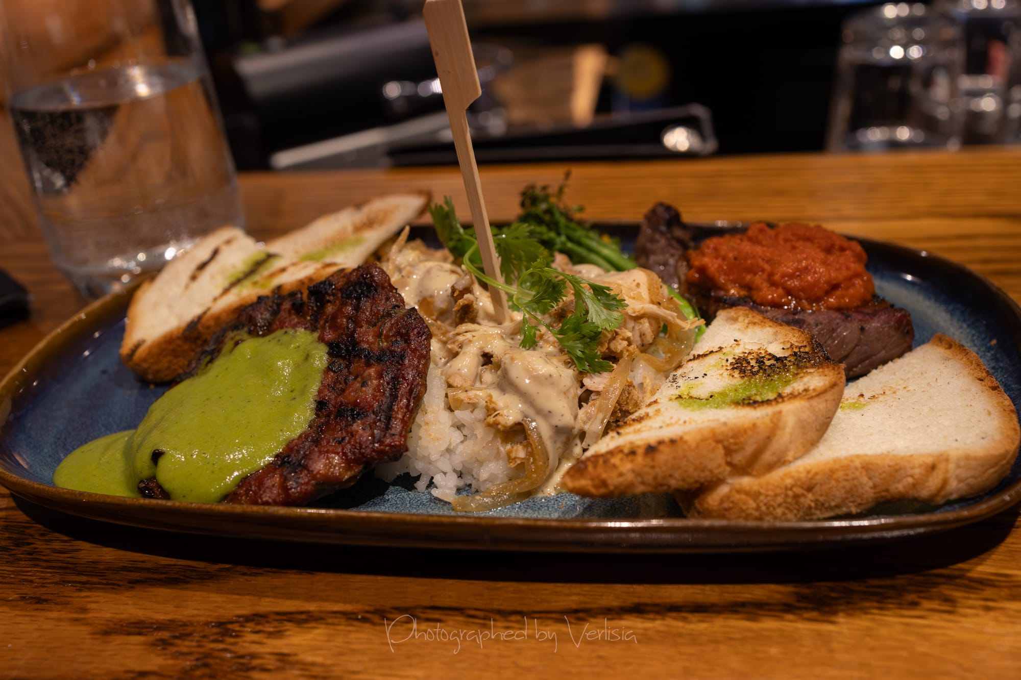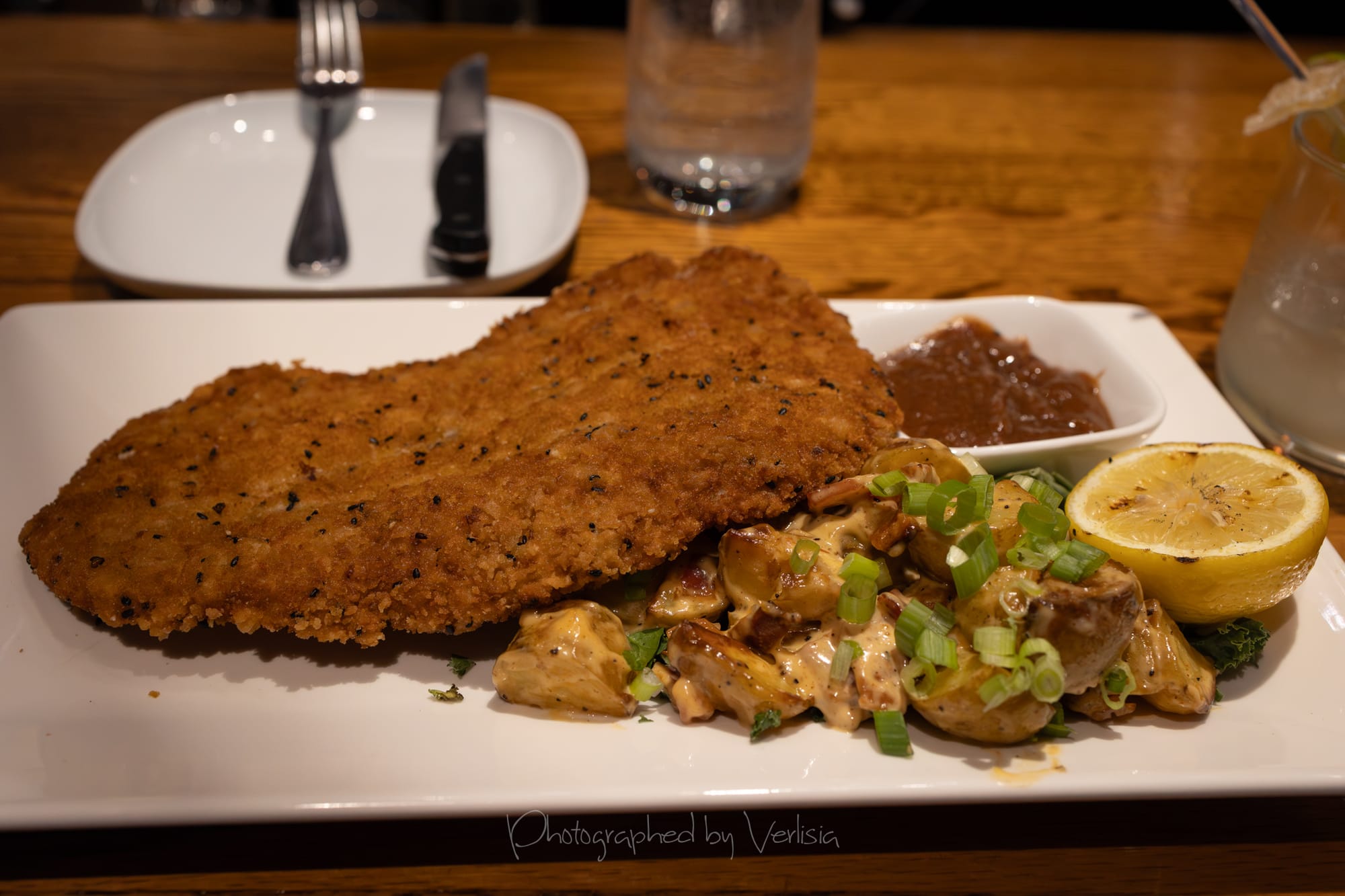 Lemon Sesame Schnitzel (Pork loin breaded with lemon zest, sesame seeds and ground crispy rice, deep fried and accompanied by apple whiskey jam. Served with warm chorizo potato salad with charred green onion aioli on a bed of mixed organic greens); The Three Pharaohs (beef tenderloin with harissa, shawarma seasoned chicken with garlic yogurt, and lamb cevapcici with mint tahini on a bed of coconut jasmine rice)