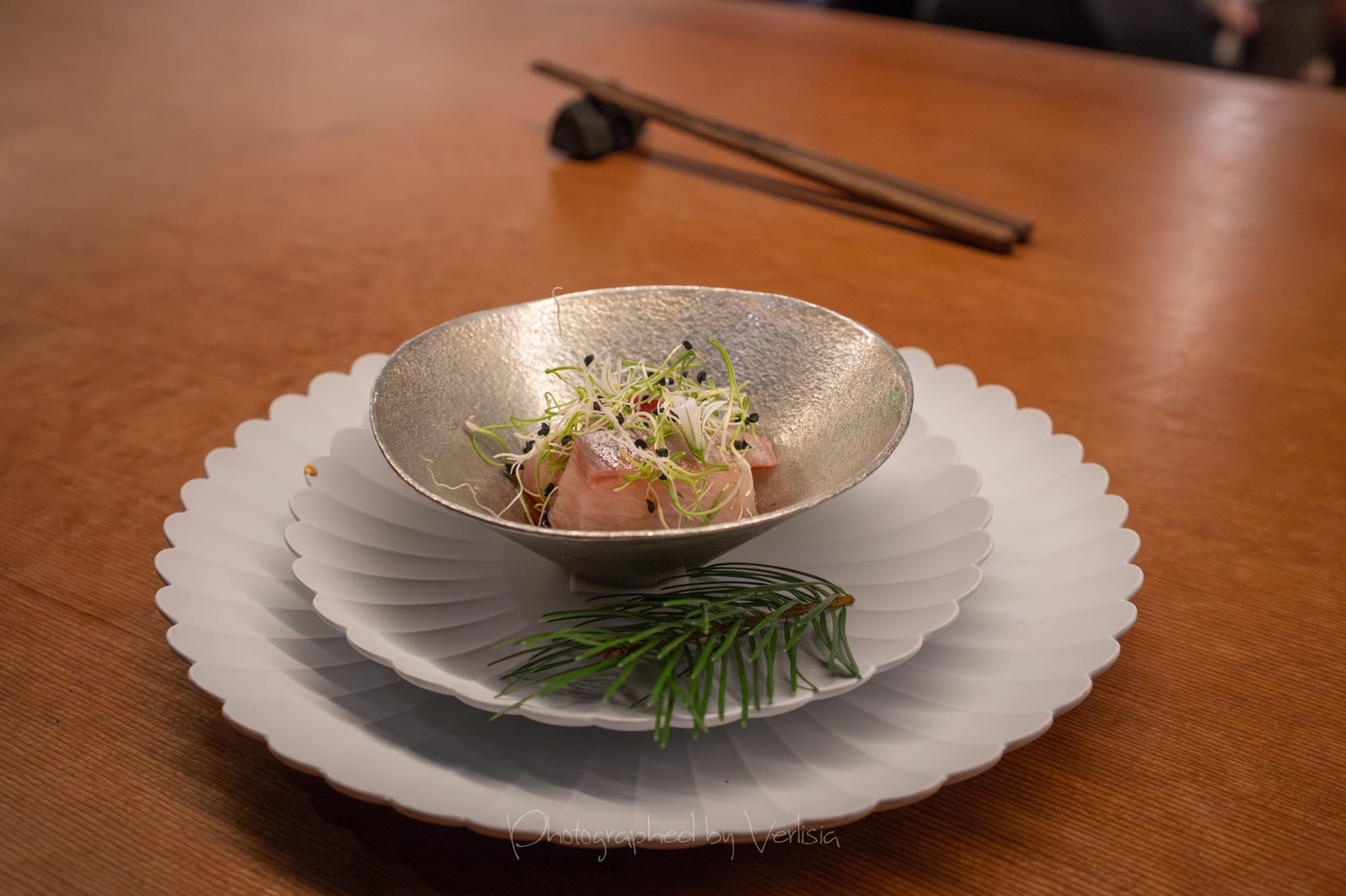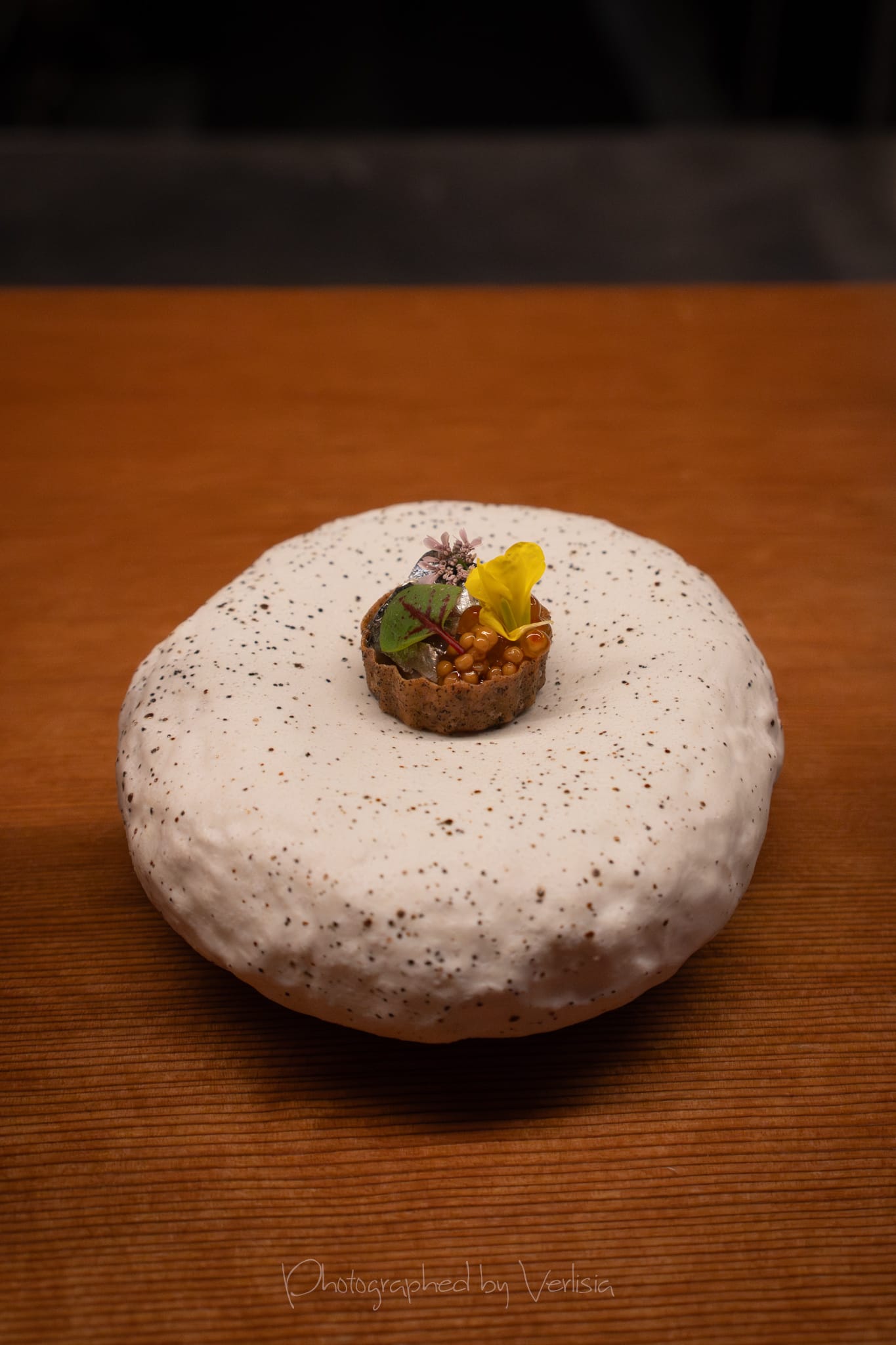 Amuse bouche - trout and caviar on buckwheat tart; coastal yellowtail crudo, srpouce, bonito ponzu