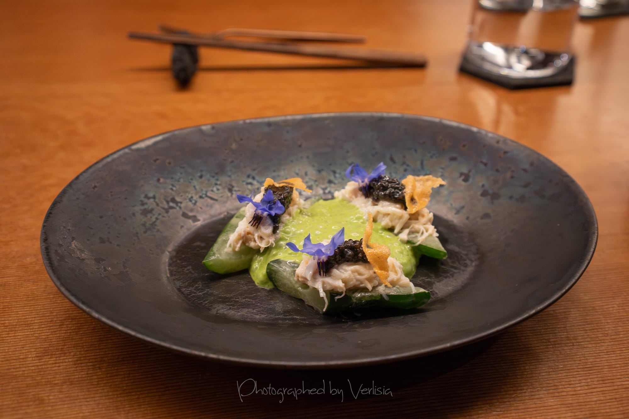 cocktail - Okinawa old fashioned; California dungeness crab, cucumber, miyoga, caviar