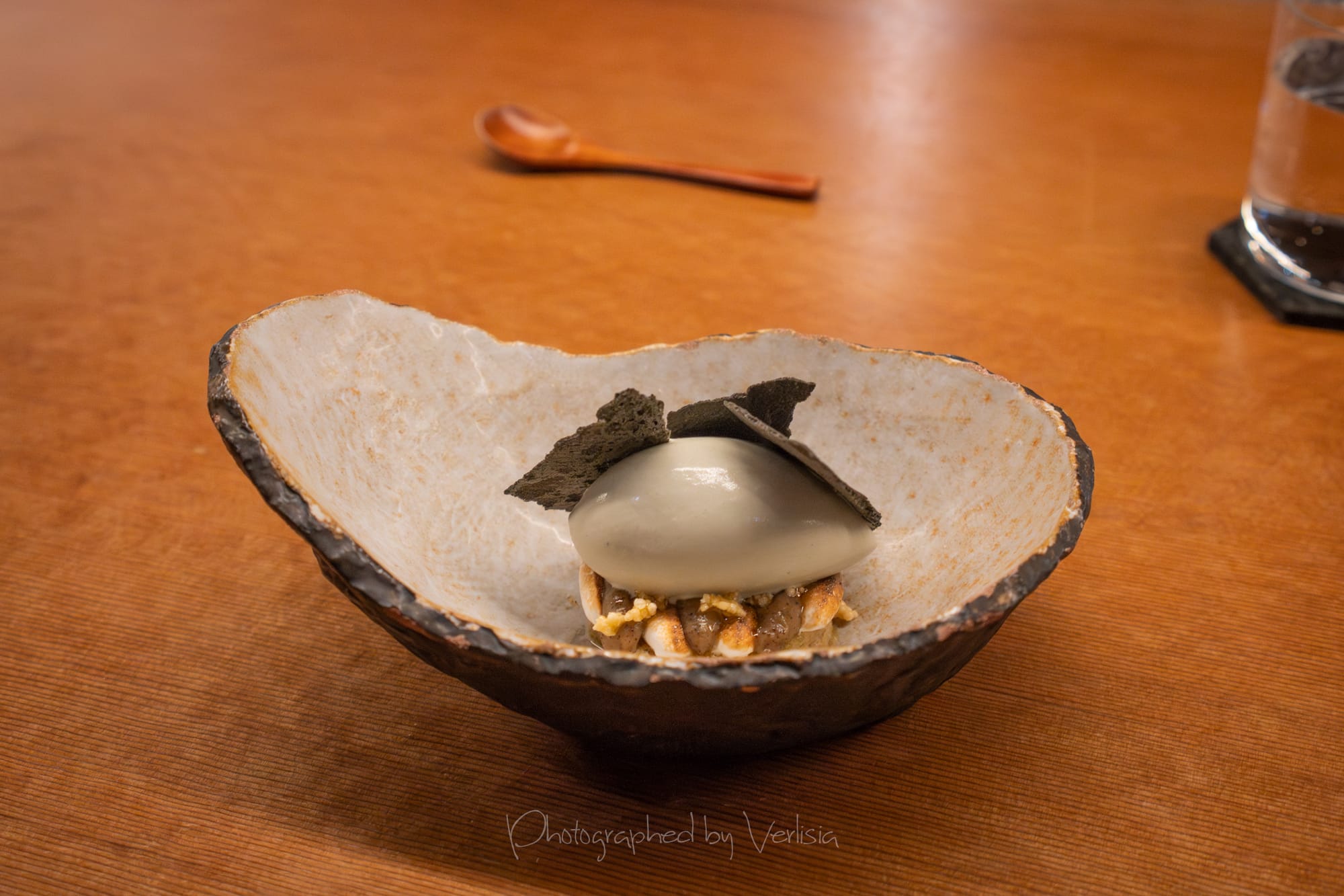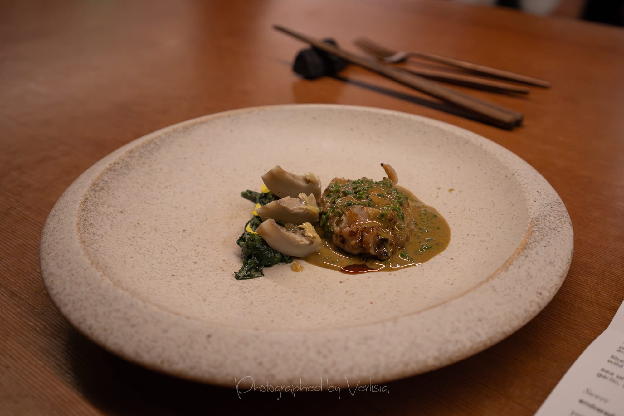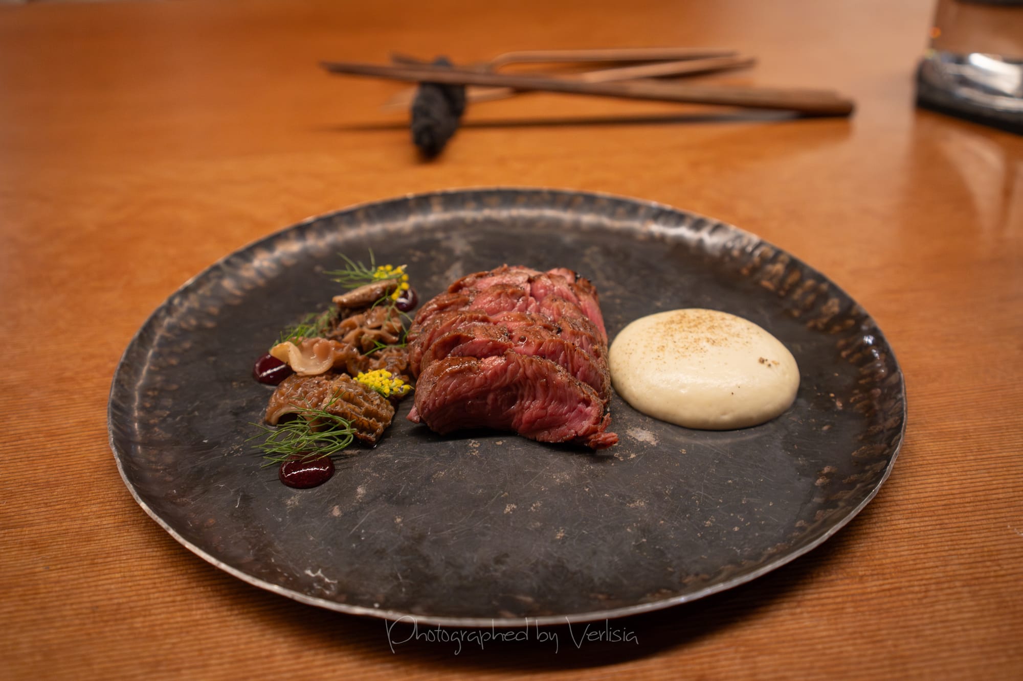 Monterey abalone and a sauce made from its liver, globe artichoke, chrysanthemum, golden raisin; ember roasted antelope, bitter chocolate, wild fennel, blackberry, morel mushroom