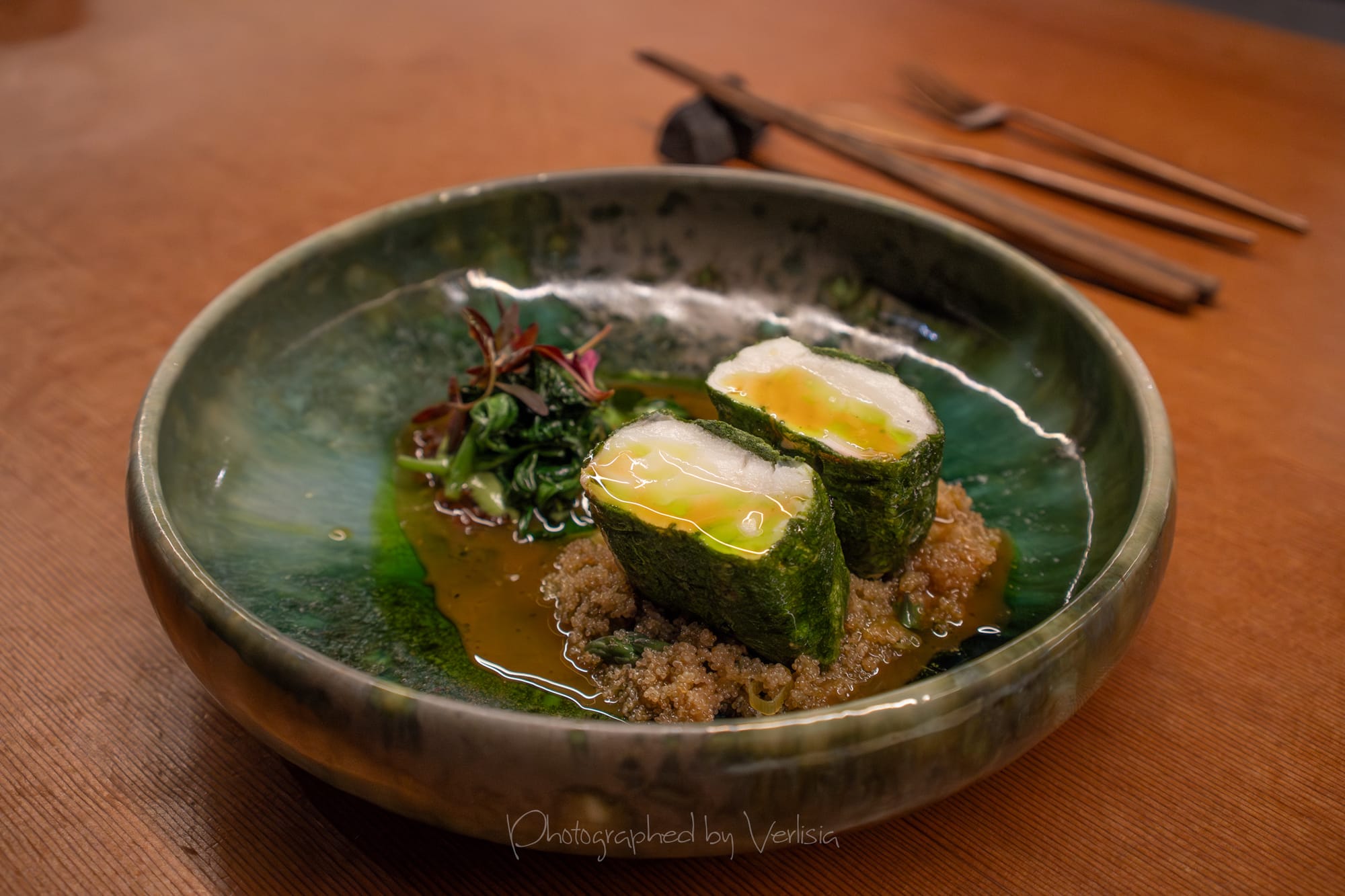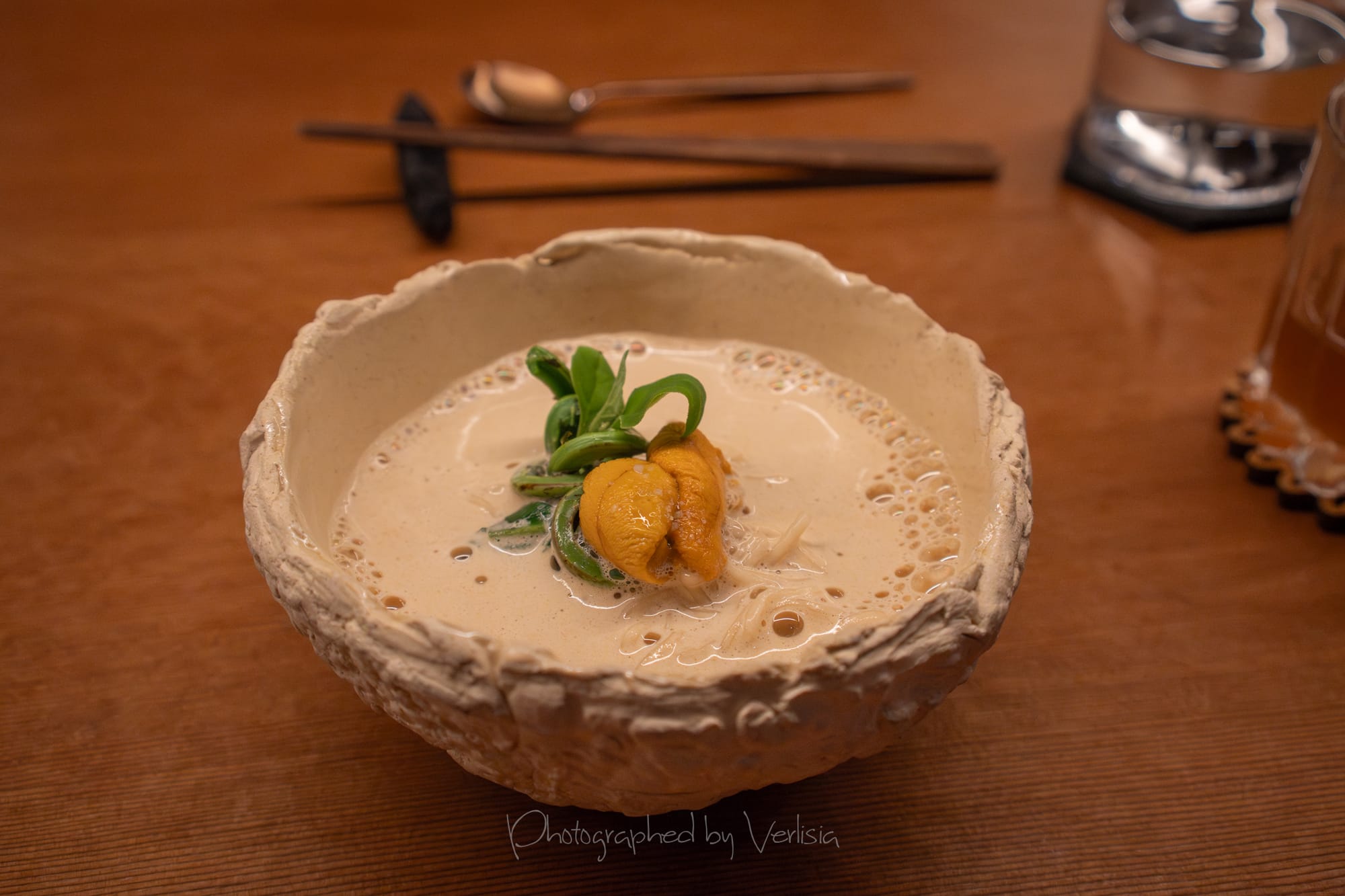 poached pacific halibut, browned butter, aromatic curry, amaranth, asparagus, fava leaf, California eucalyptus; sea urchin noodles, wild fern tops, charcoal-scented black garlic, uni-lobster broth
