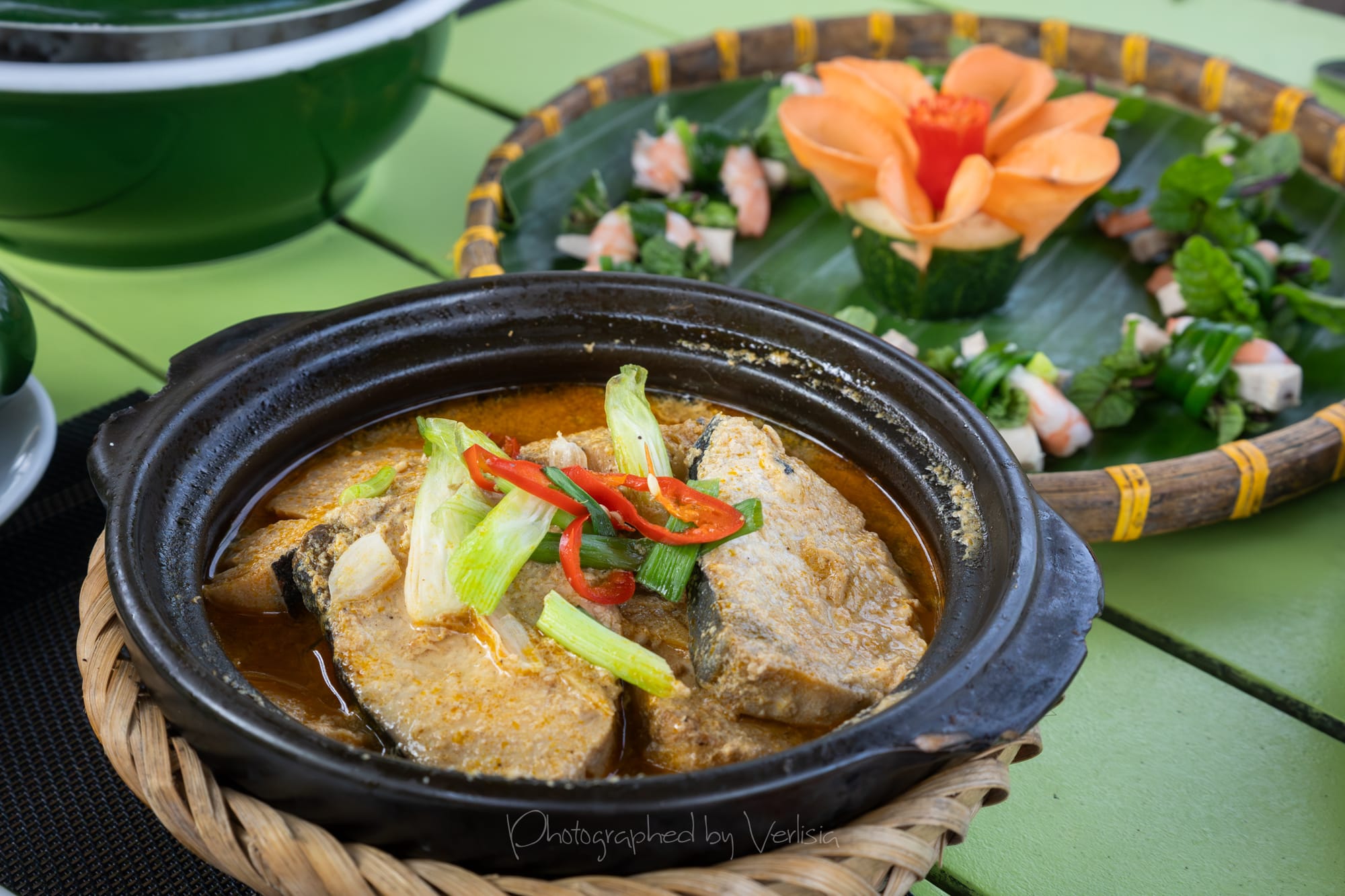 Grilled Pork & Beef in Piper Lolot Leaves - pork and beef rolled in piper lolot leaves and grilled on charcoal; Braised Fish in a Clay Pot with Thai Basil - braised mackerel with thai basil, ginger, green onion, red chili, and garlic. Served with rice