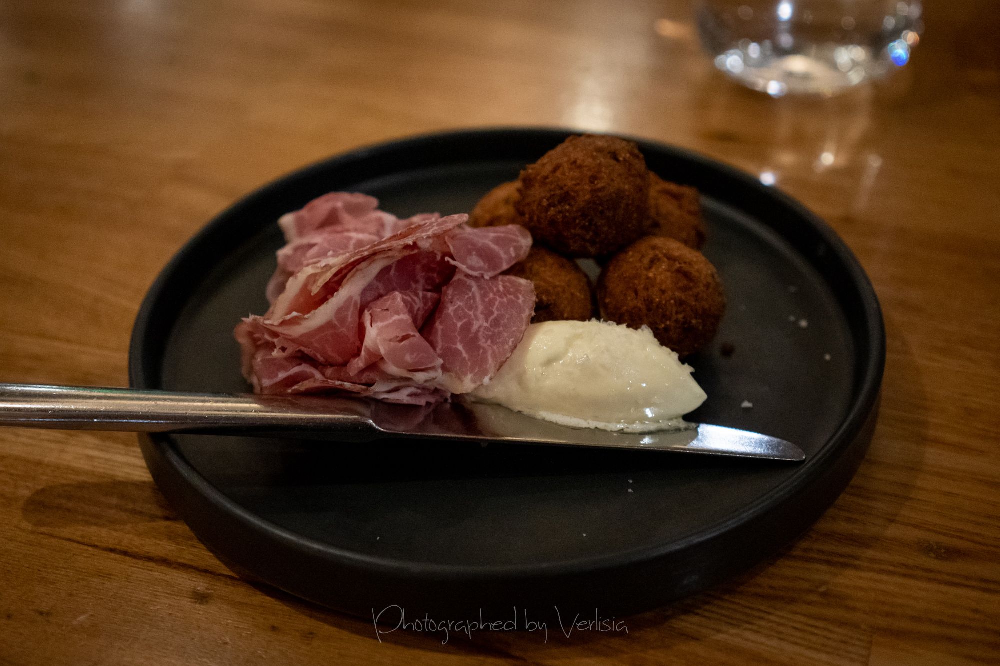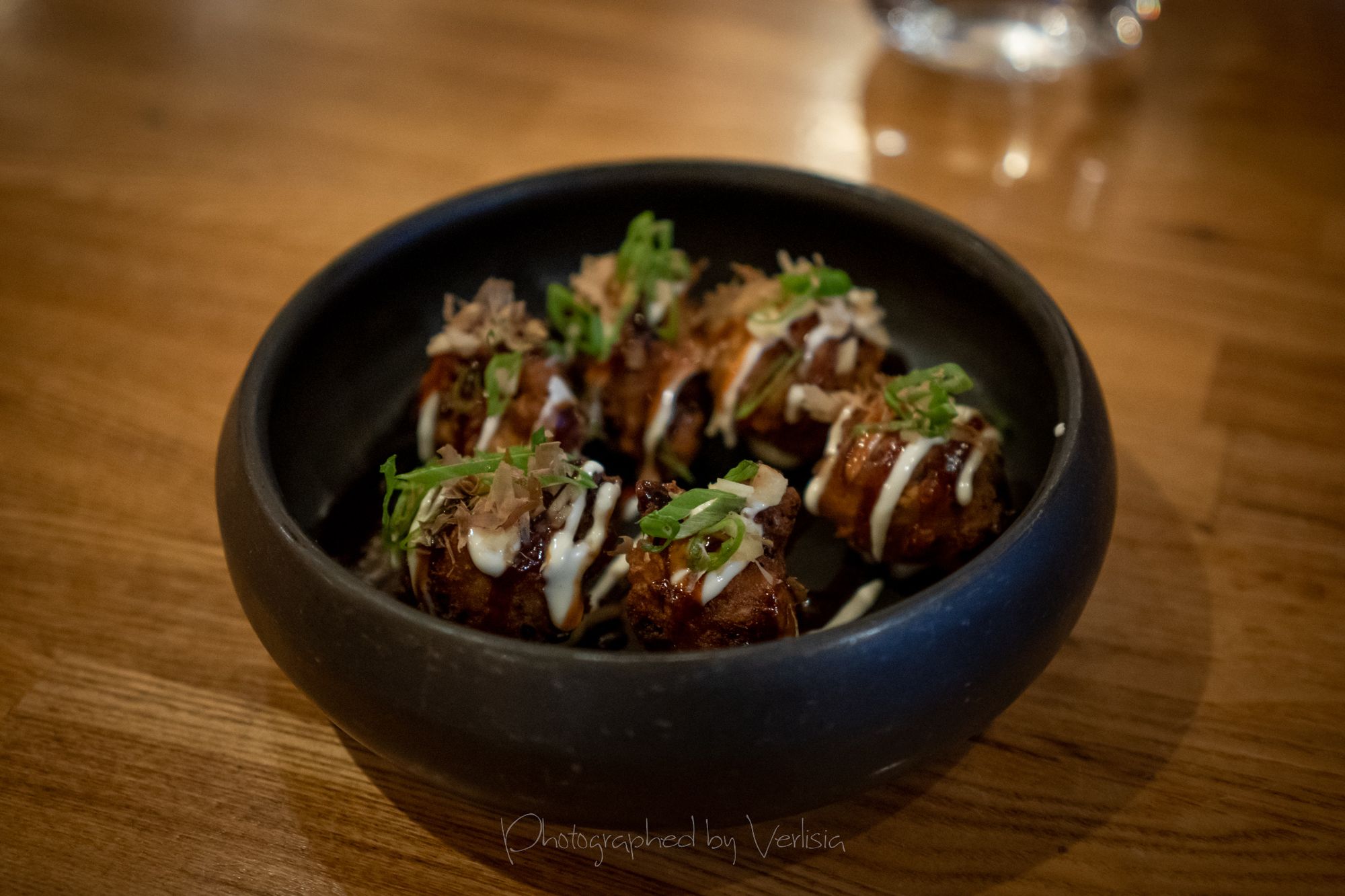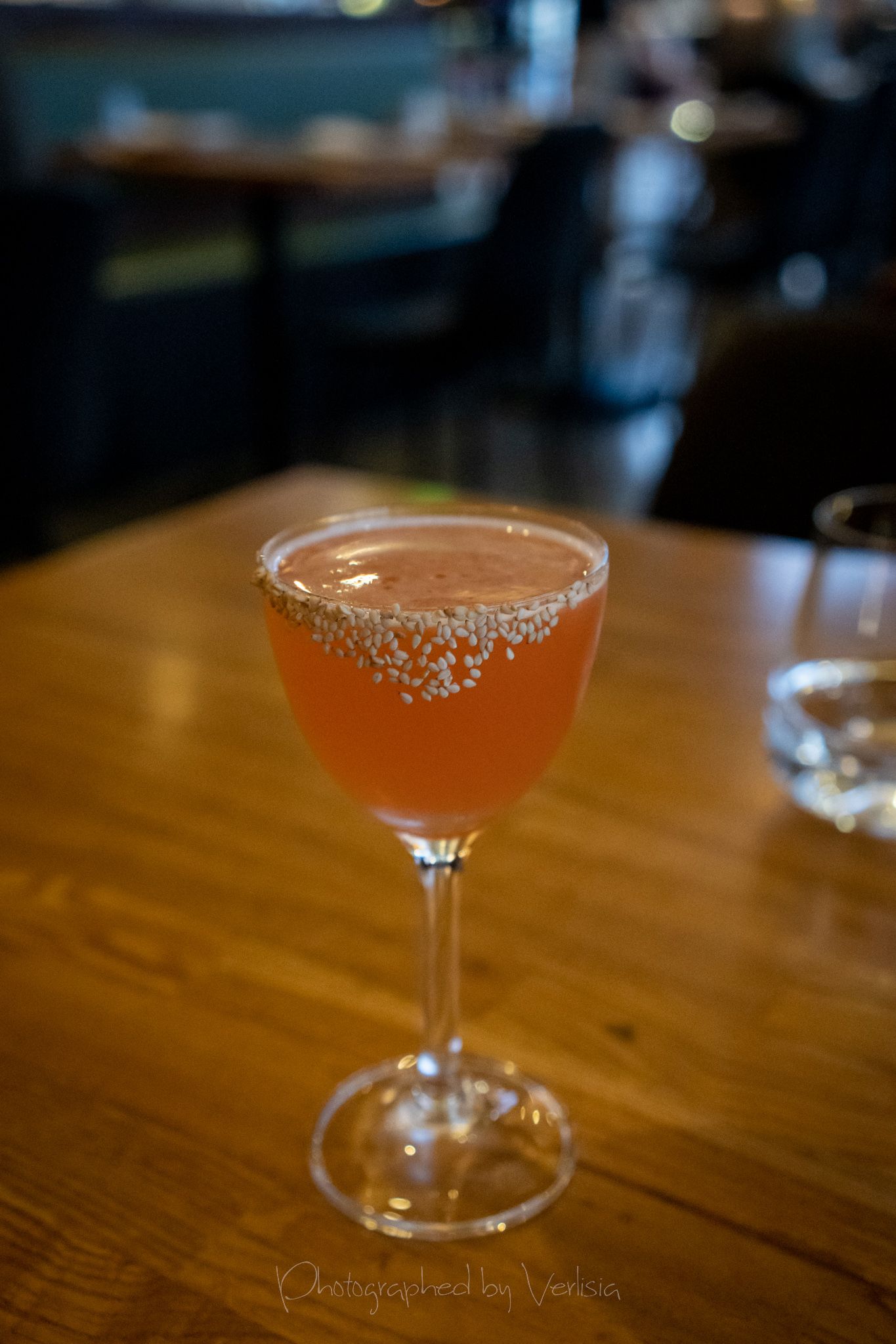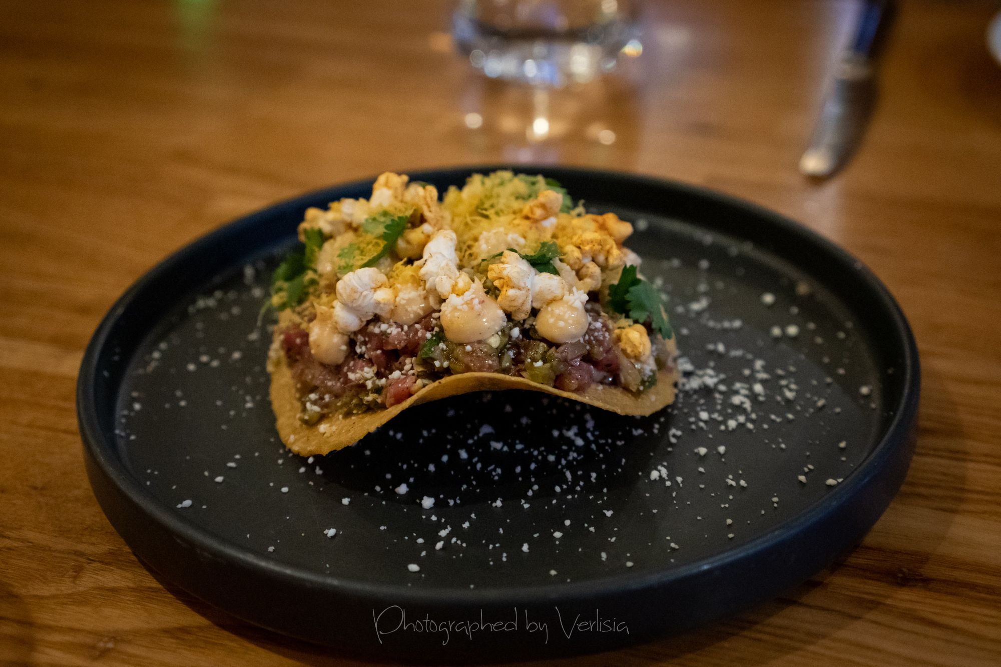 Friendship Garden (maker's mark, lemon, strawberry, aperol, toasted sesame), Beef Tartare (tostada, nopales, tajin aioli, spiced popcorn, cured egg yolk, fermented jalapeno)Octopus Fritters (okonomi sauce, mayo, pickled ginger, bonito flakes, scallion), Hush Puppies (house-made ham, cultured honey butter, sea salt)