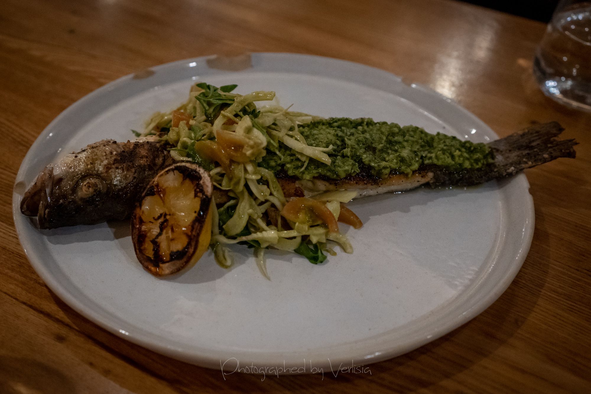 White Grilled Branzino (herb relish, campari tomatoes, shaved fennel, grilled lemon)