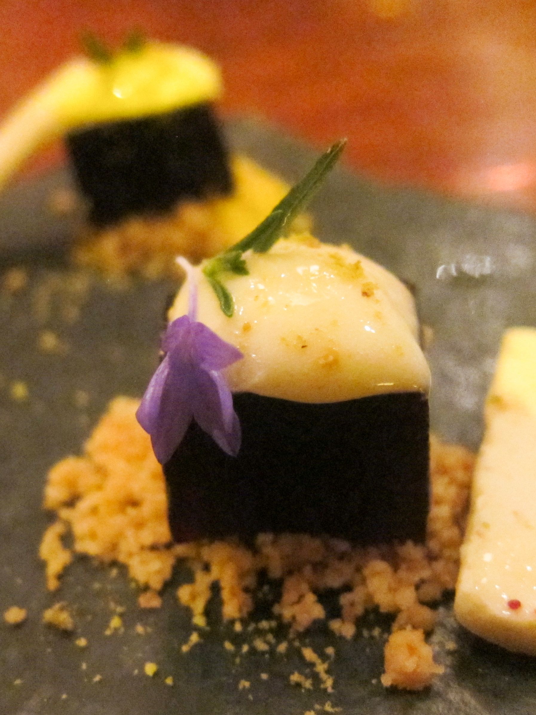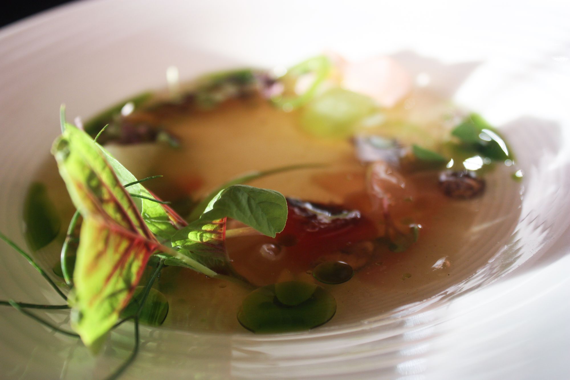 Mignardises (Blueberry pâte de fruits, Meyer lemon curd, white chocolate), Amuse (Tomato/melon summer agua), Chilled cantaloupe and sage gazpacho infused with roasted corn husks (spicy charred lime peanuts, pickled radish, onion top oil)