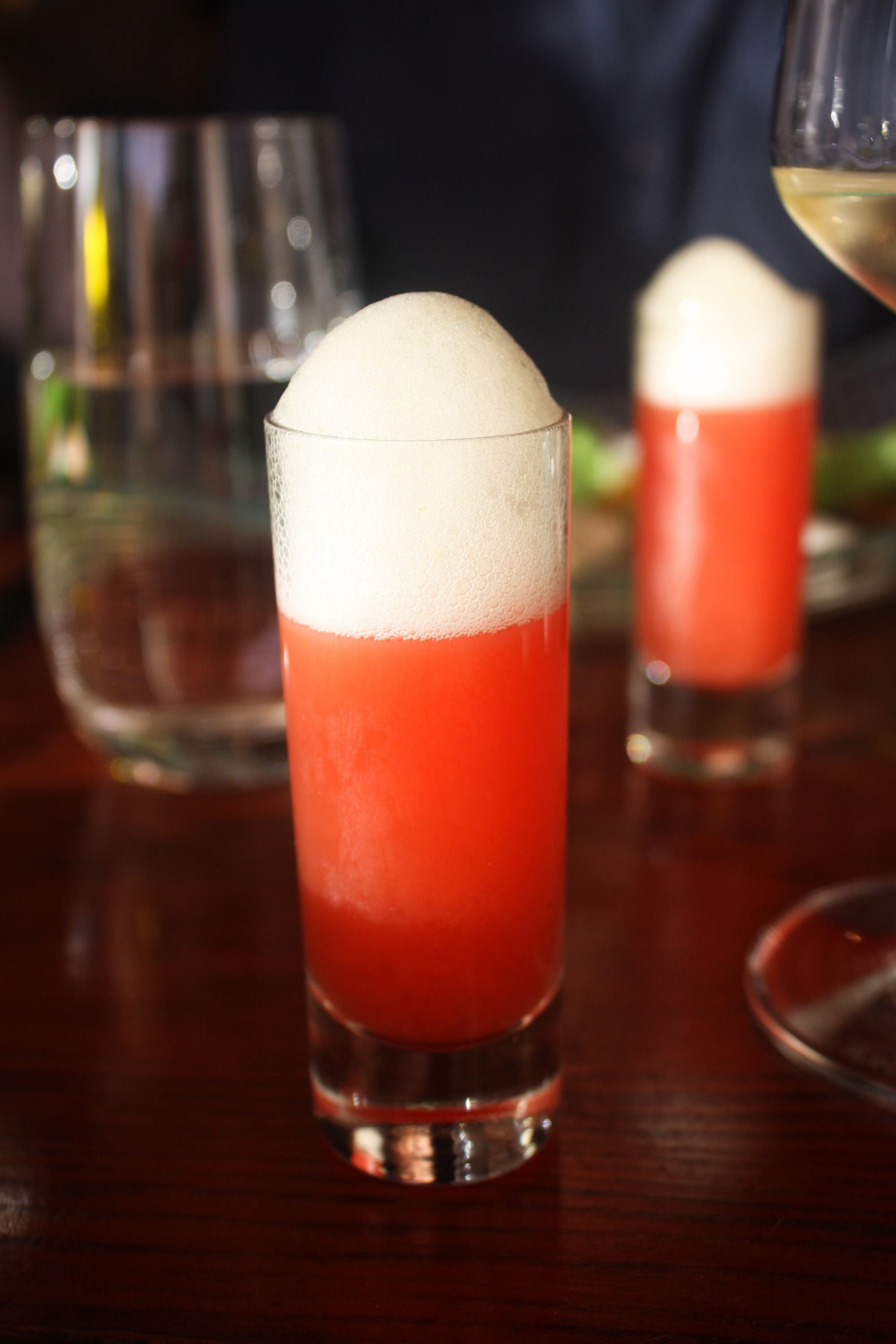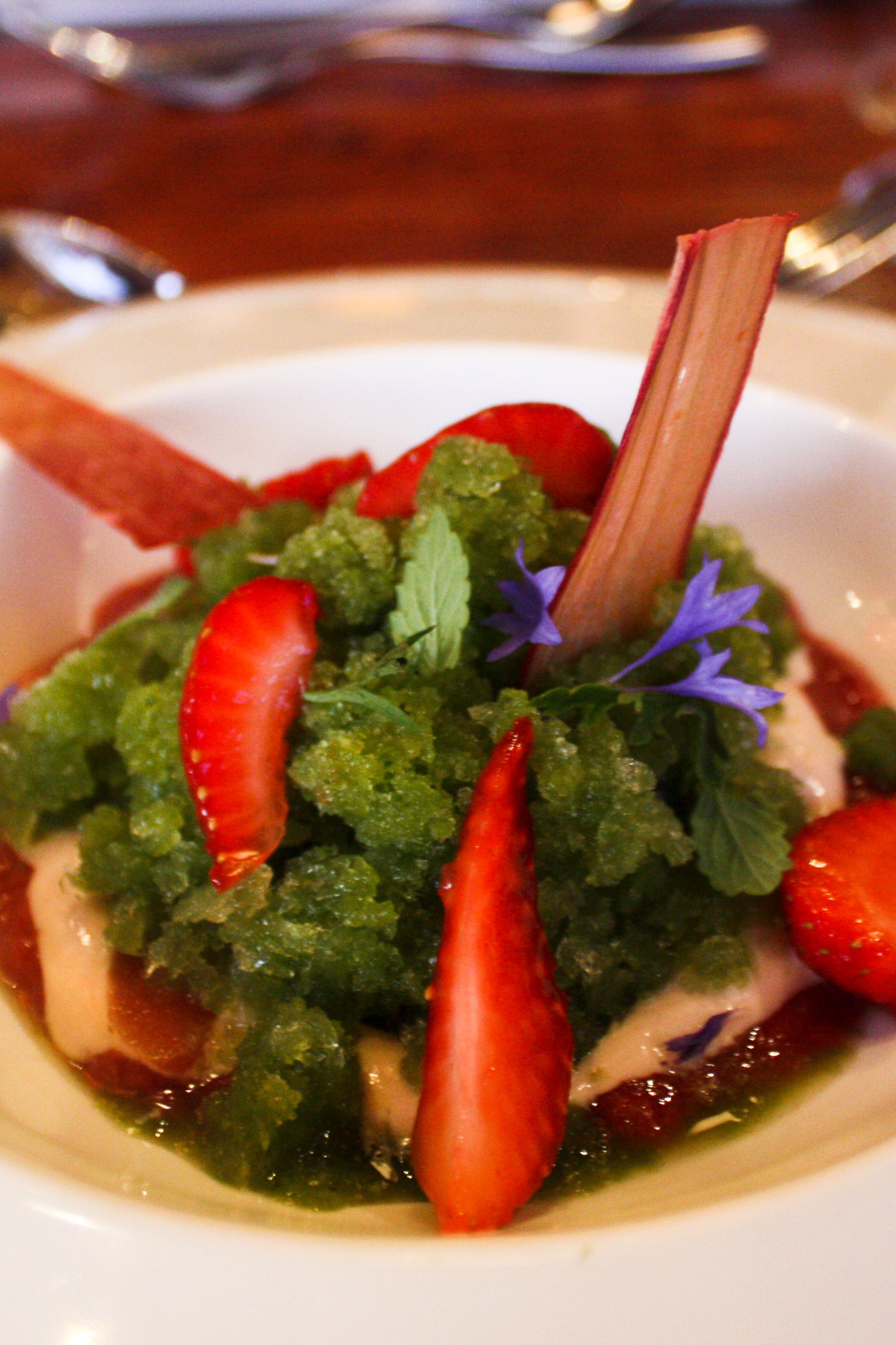 Warm focaccia with truffled pecorino from florence and apricot/almond agrodolce (‘purple haze’ carrots, crudite, fennel fronds, ‘rat tail’ radish), rhubarb jam and pickles with cucumber granita, Silverado trail strawberry pudding