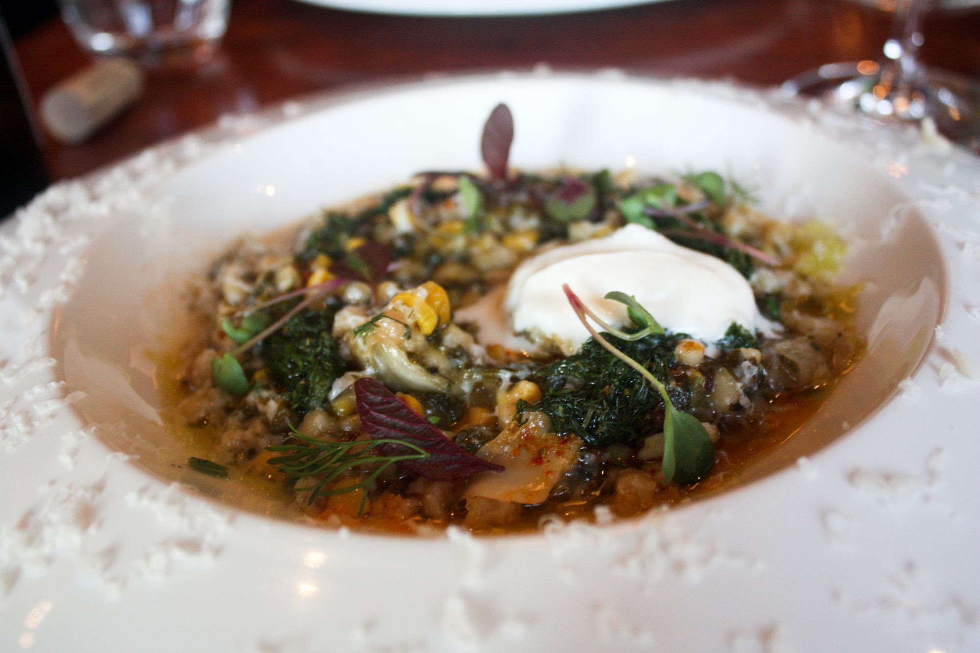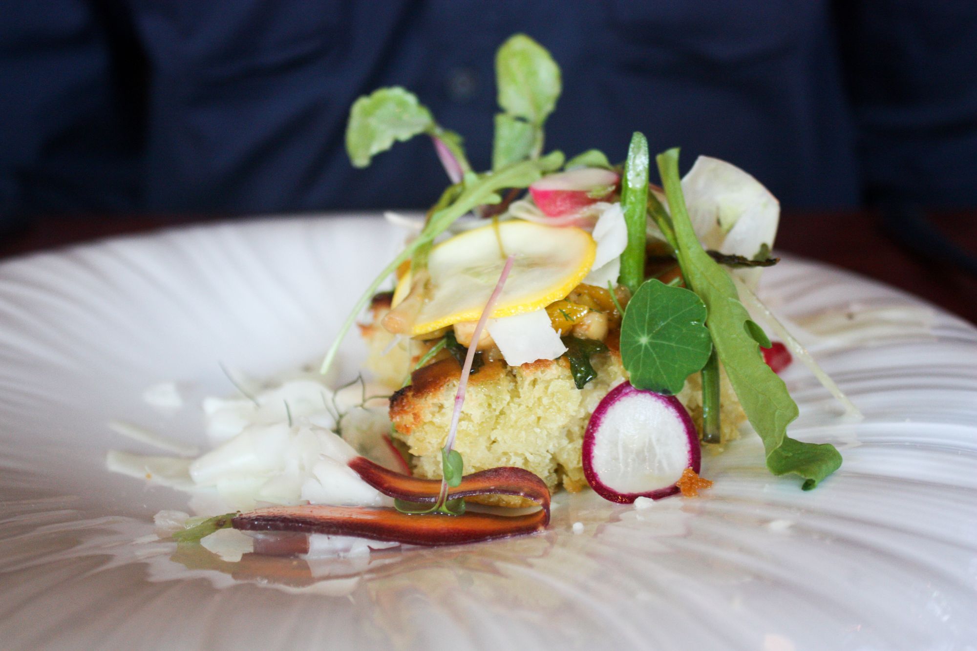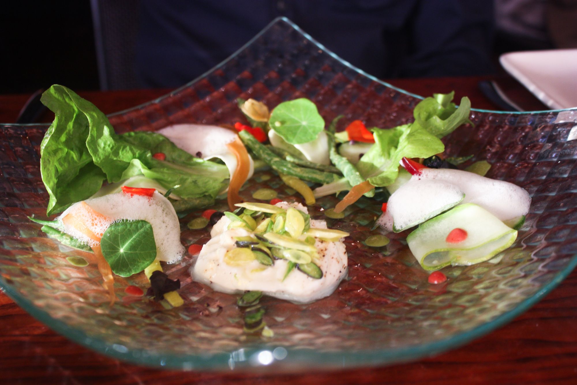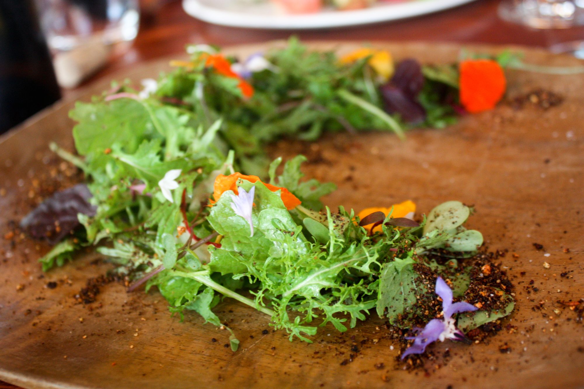 The garden snake (lightly dressed greens, leaves, flowers, roots), fresh extruded ‘seville’ orange fregola (a sardinian toasted pearl pasta)