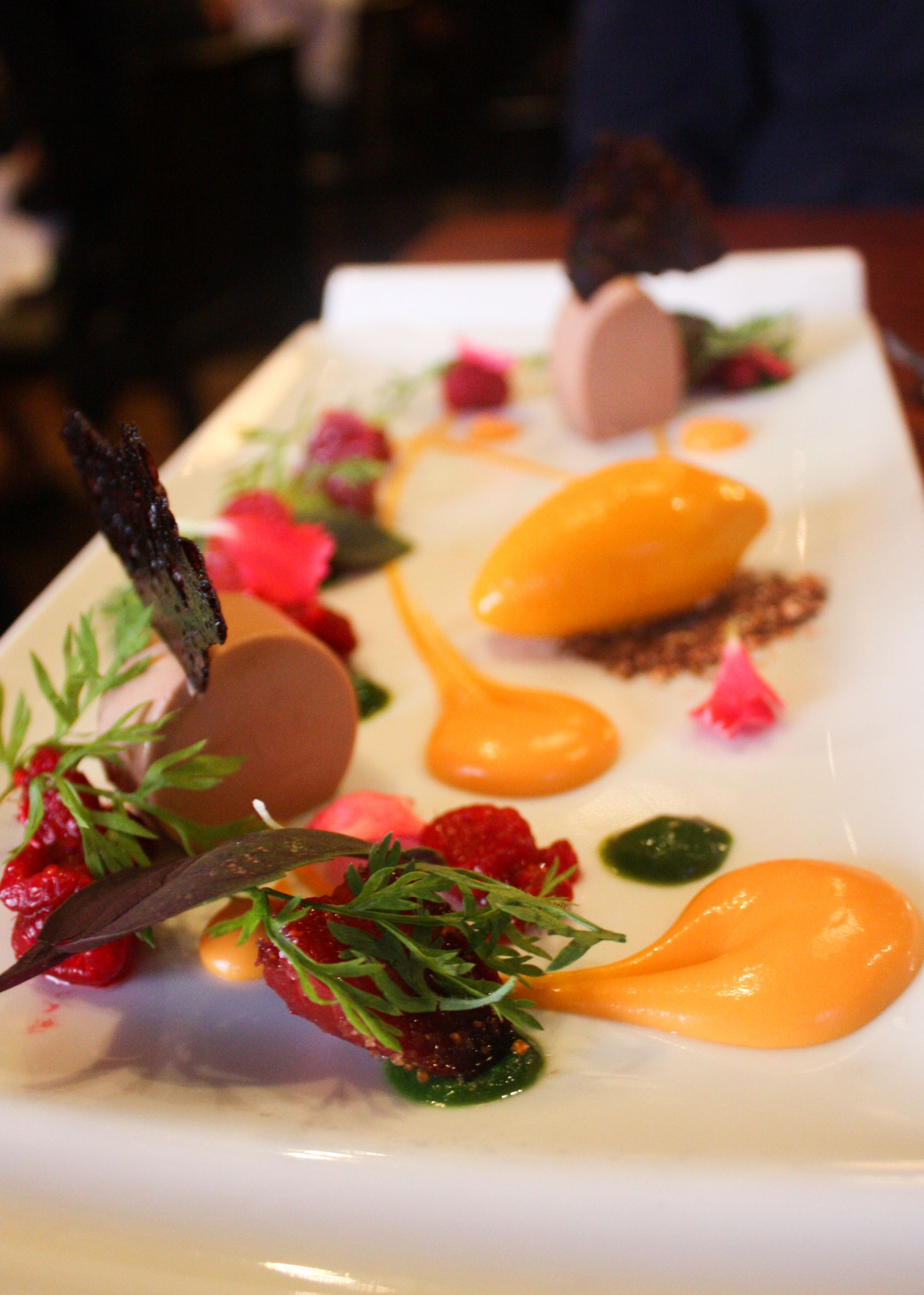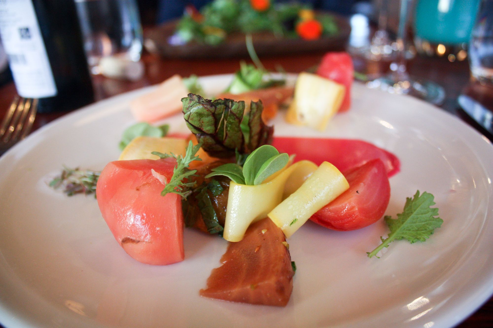 Pole bean and smoked cucumber salad with cool burrata and miso radish (pickled corn cloud, ‘flavorosa’ plouts, tarragon dressing), Assorted beets (roast and a la giardiniera, with preserved lime and pistachio)