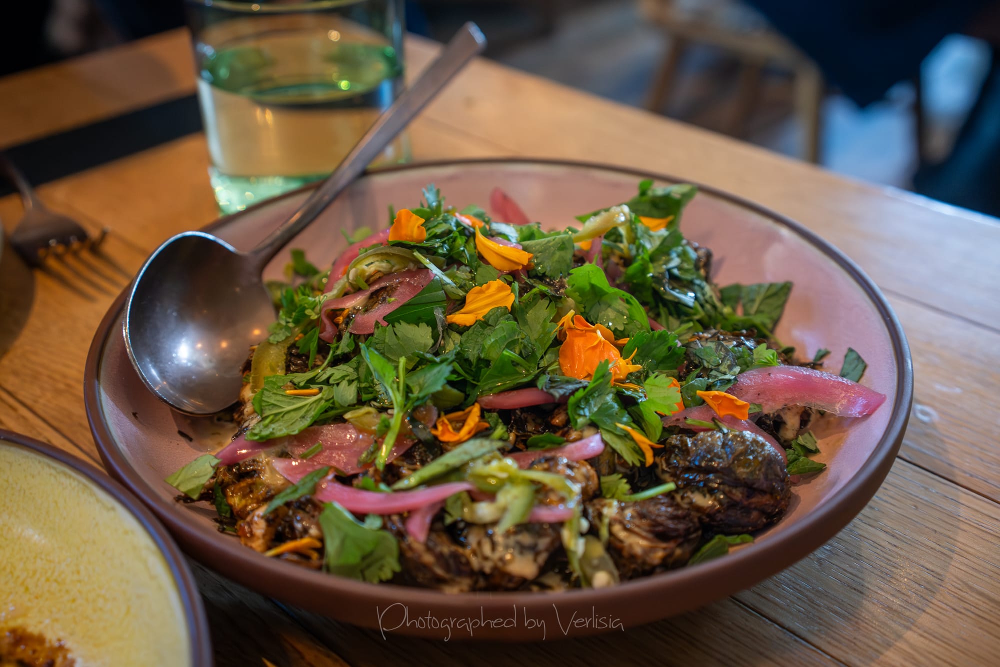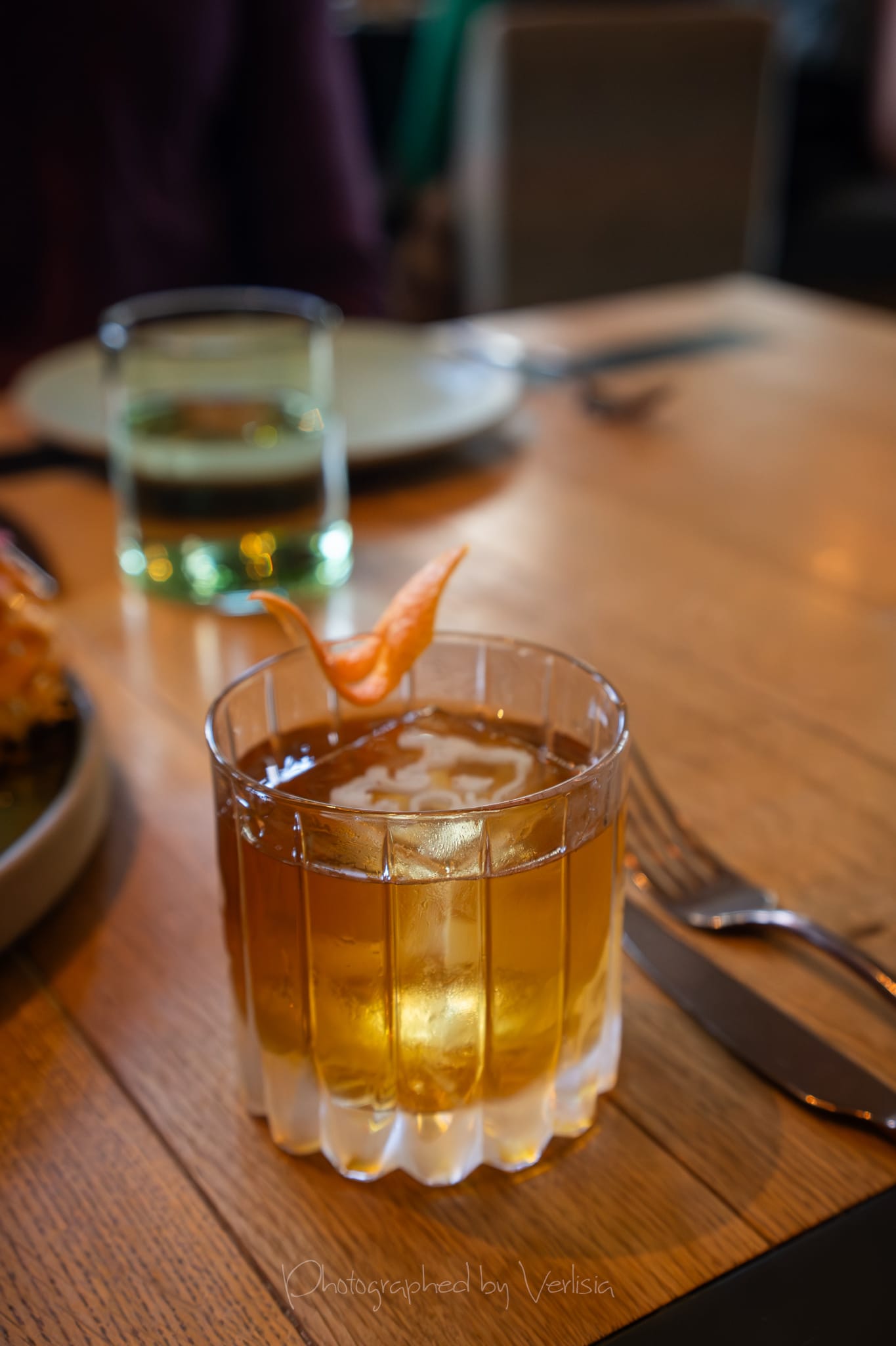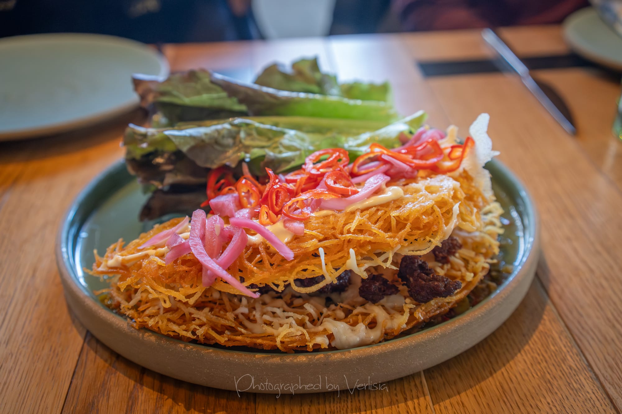 Potato Crepe (viet sausage, fish sauce mayo, thai sweet + sour, pickled red onions + fresnos, lettuce cups); Cocktail - Goat Fashioned (wild turkey bourbon, banana liqueur, cacao bitters)