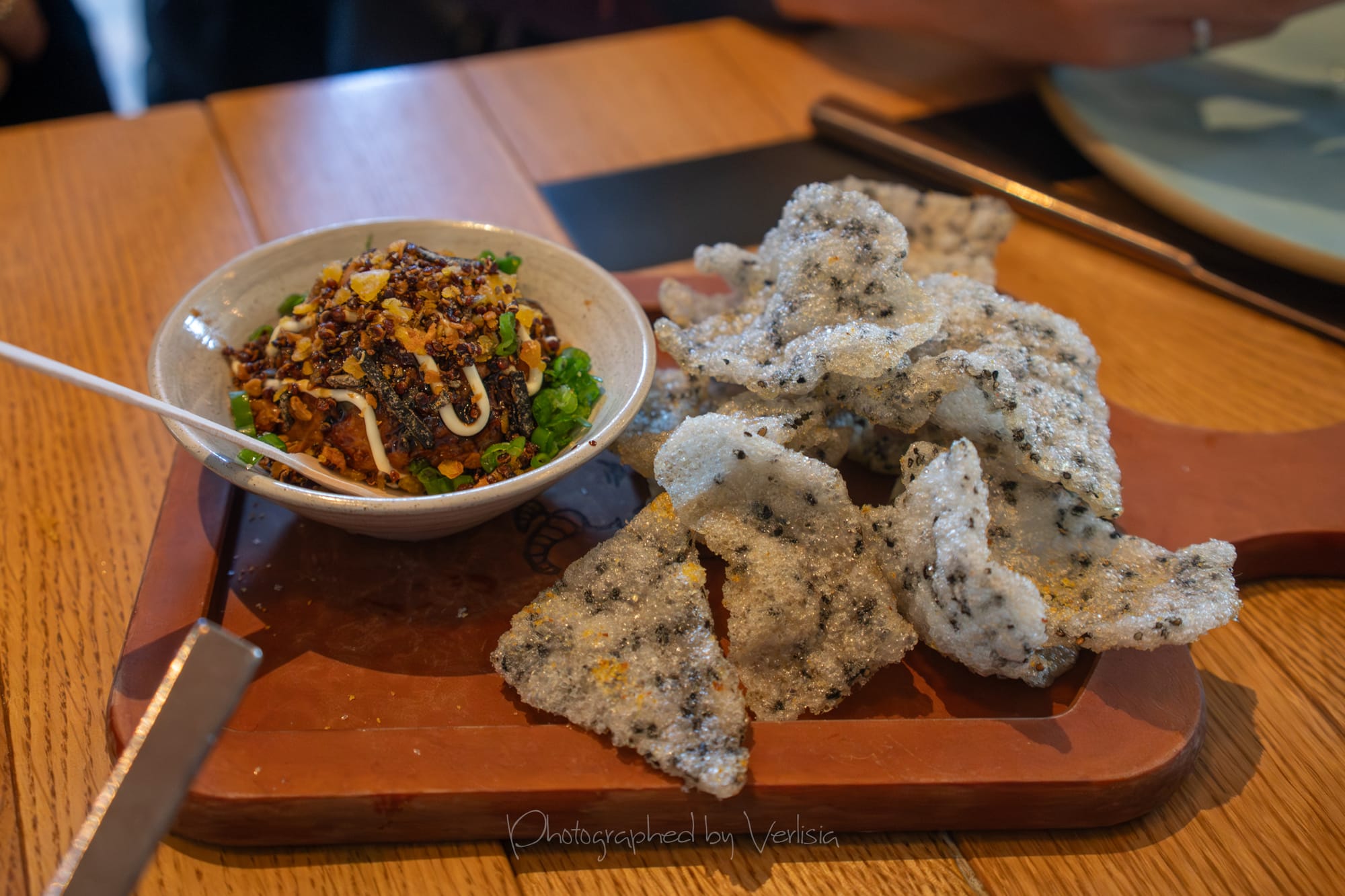 Spicy Handroll Dip (tuna, hamachi, chili-seasame, spiced rice chips); Crispy quinoa + Tuna poke salad (pickled veggies, candied pecans)