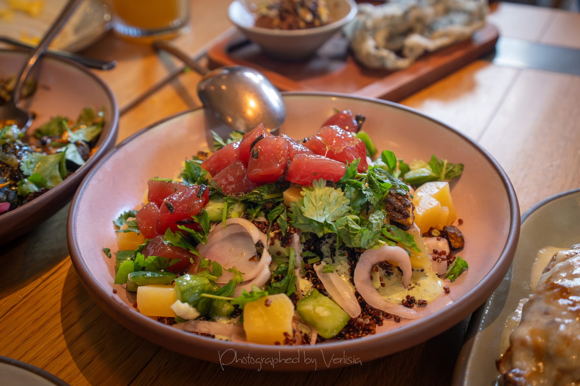 Yolk-Onomiyaki (hoisin crema, sweet soy drizzle, furikake); Crispy Quinoa + Tuna Poke Salad (pickled veggies, candied pecans)
