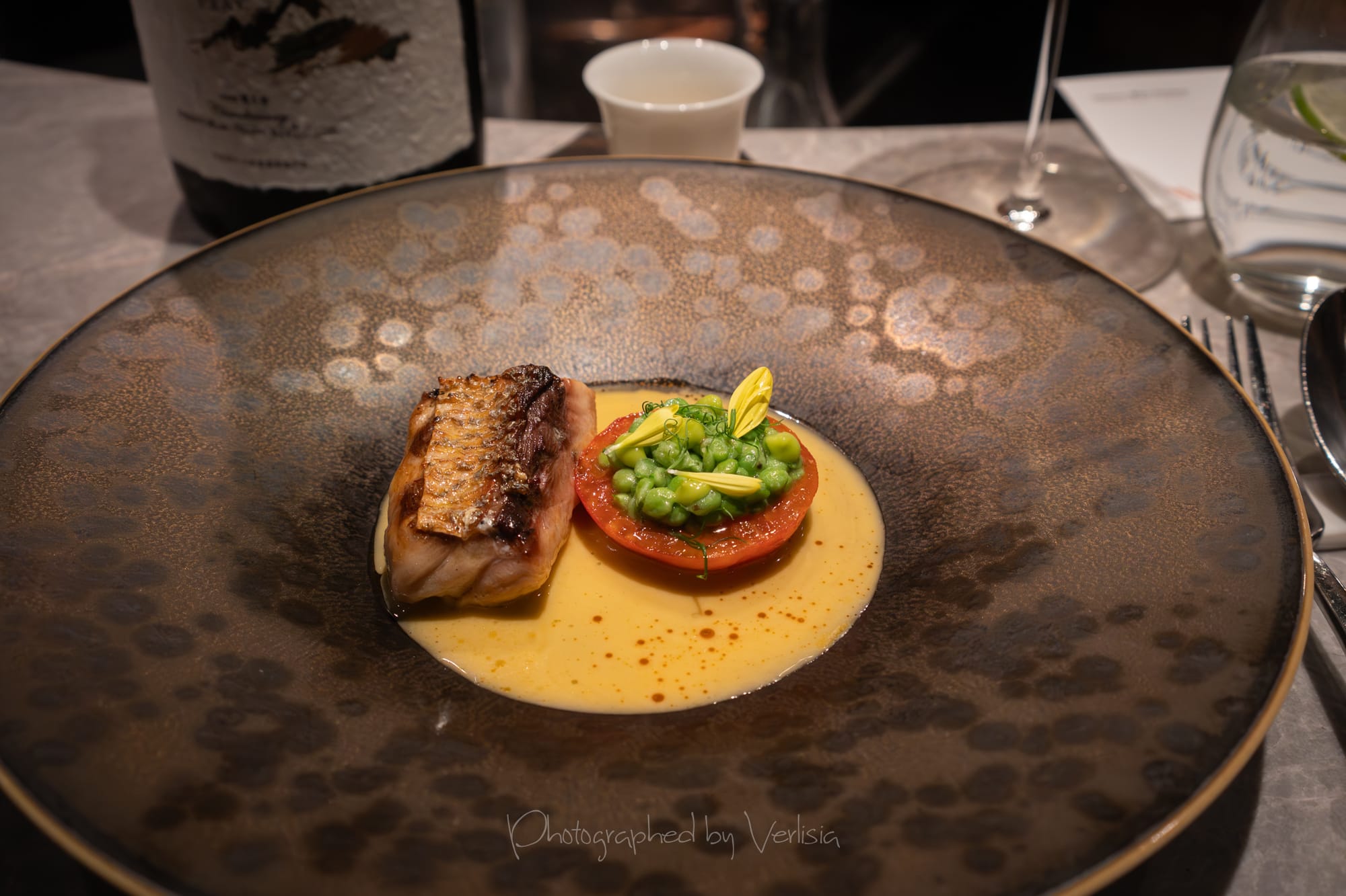 Threadfin (Fruit Tomato, Snap Peas, Doubanjian); Wine Pairing - Chardonnay, Legacy Peak, Helan Mountain - Ningxia, 2022