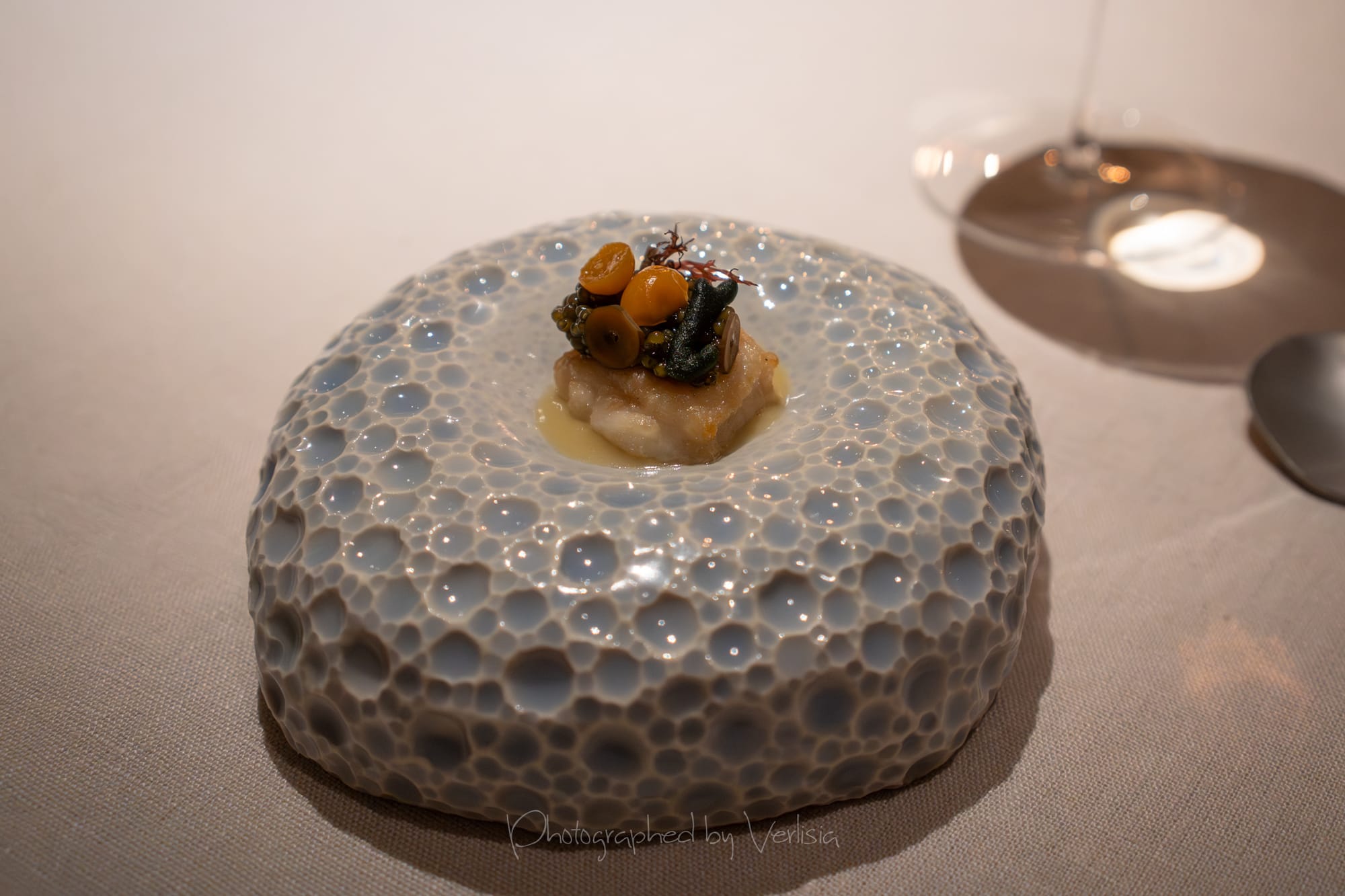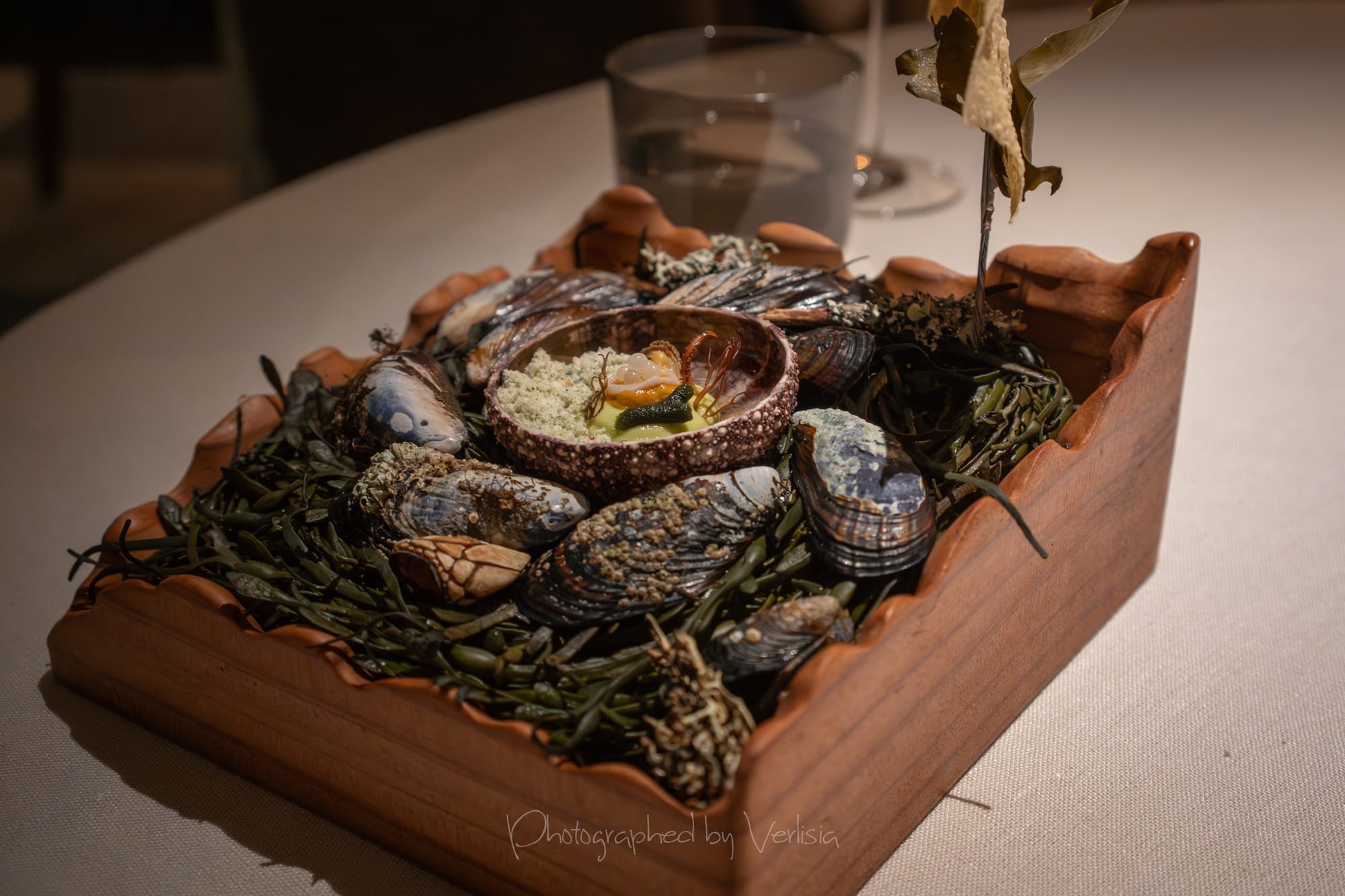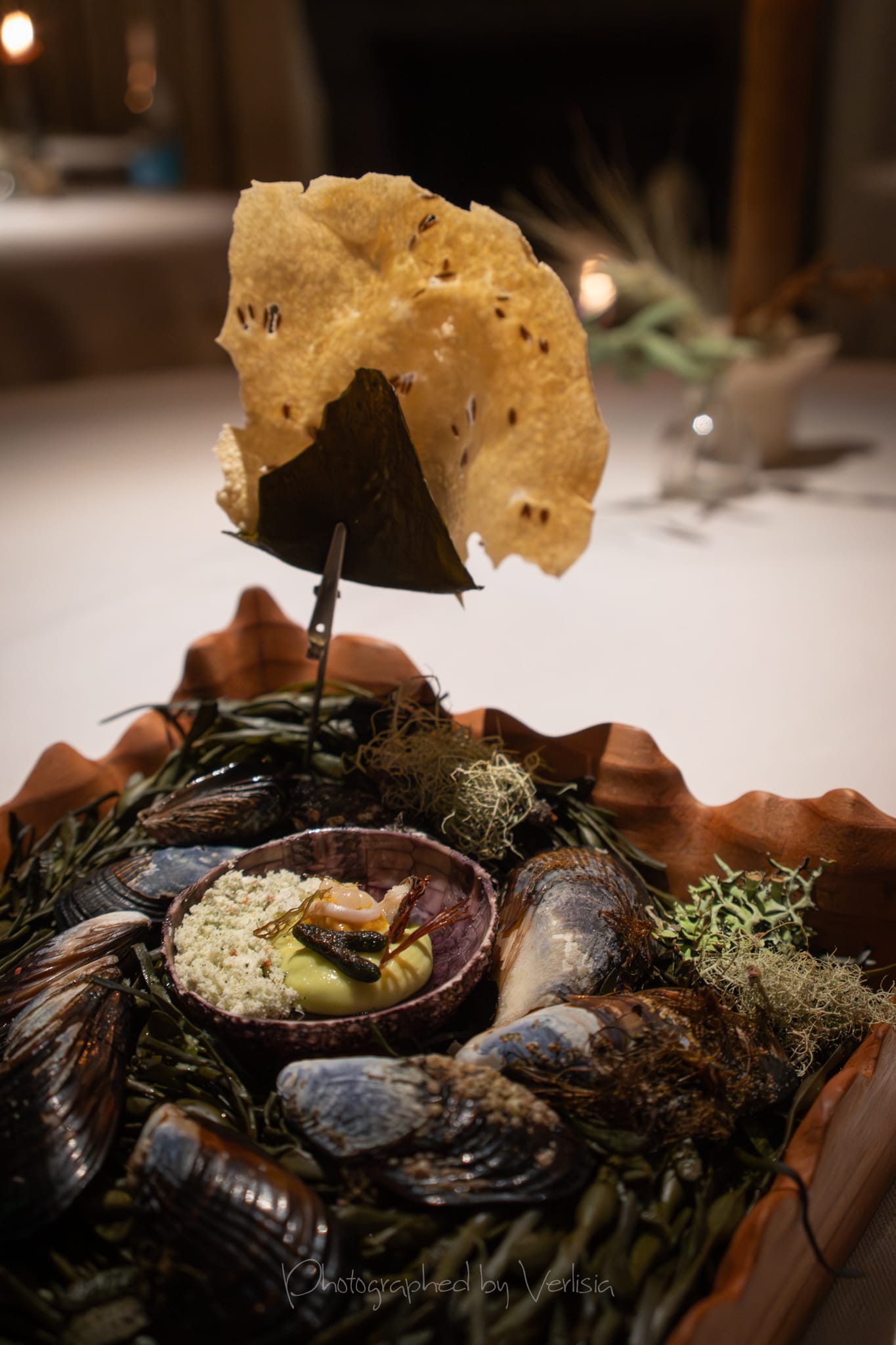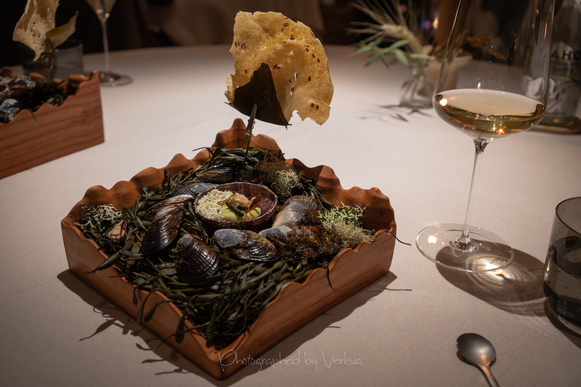 Half Moon Bay (mussel, sea urchin, papadum); Albarino, 2023 Bodegas Albamar, "Alma de Mar', Rias Baixas