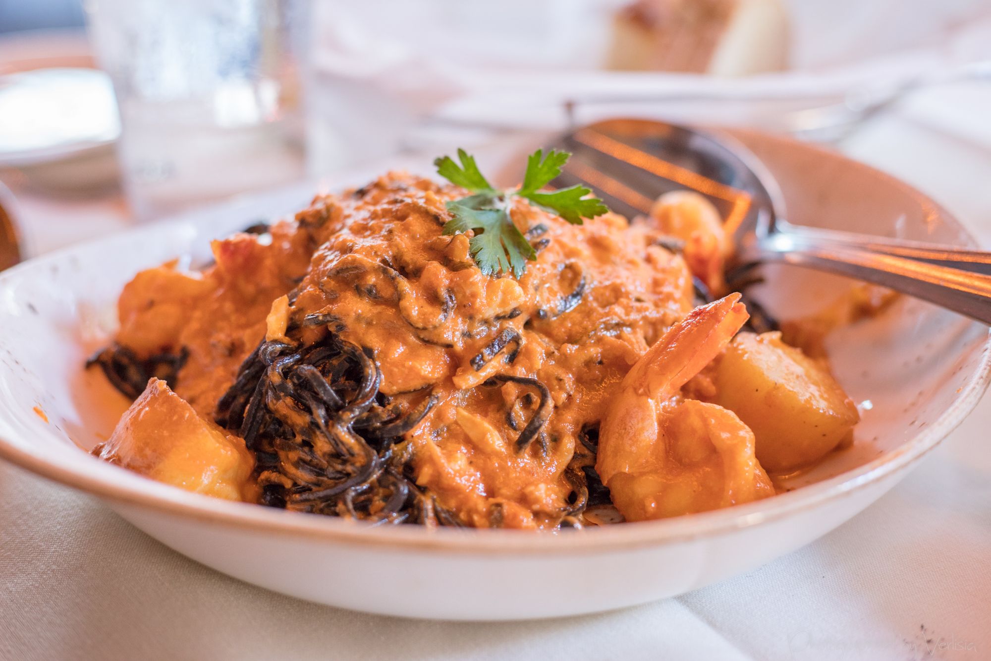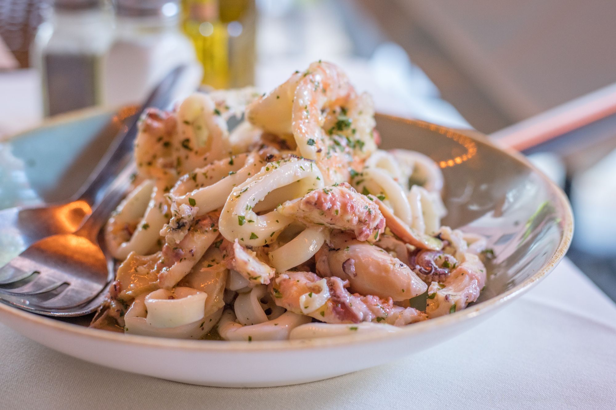 Fritto di Calamari, Spaghetti Neri al Pesce (Black squid ink spaghetti tossed with sage, shrimp, lump crab, scallops, simmered in a creamy rose sauce)Grigilata Misto (Sea scallops, calamari, octopus and shrimp fried grilled, laced with aged balsamic and Fantoio E.V.O.O)
