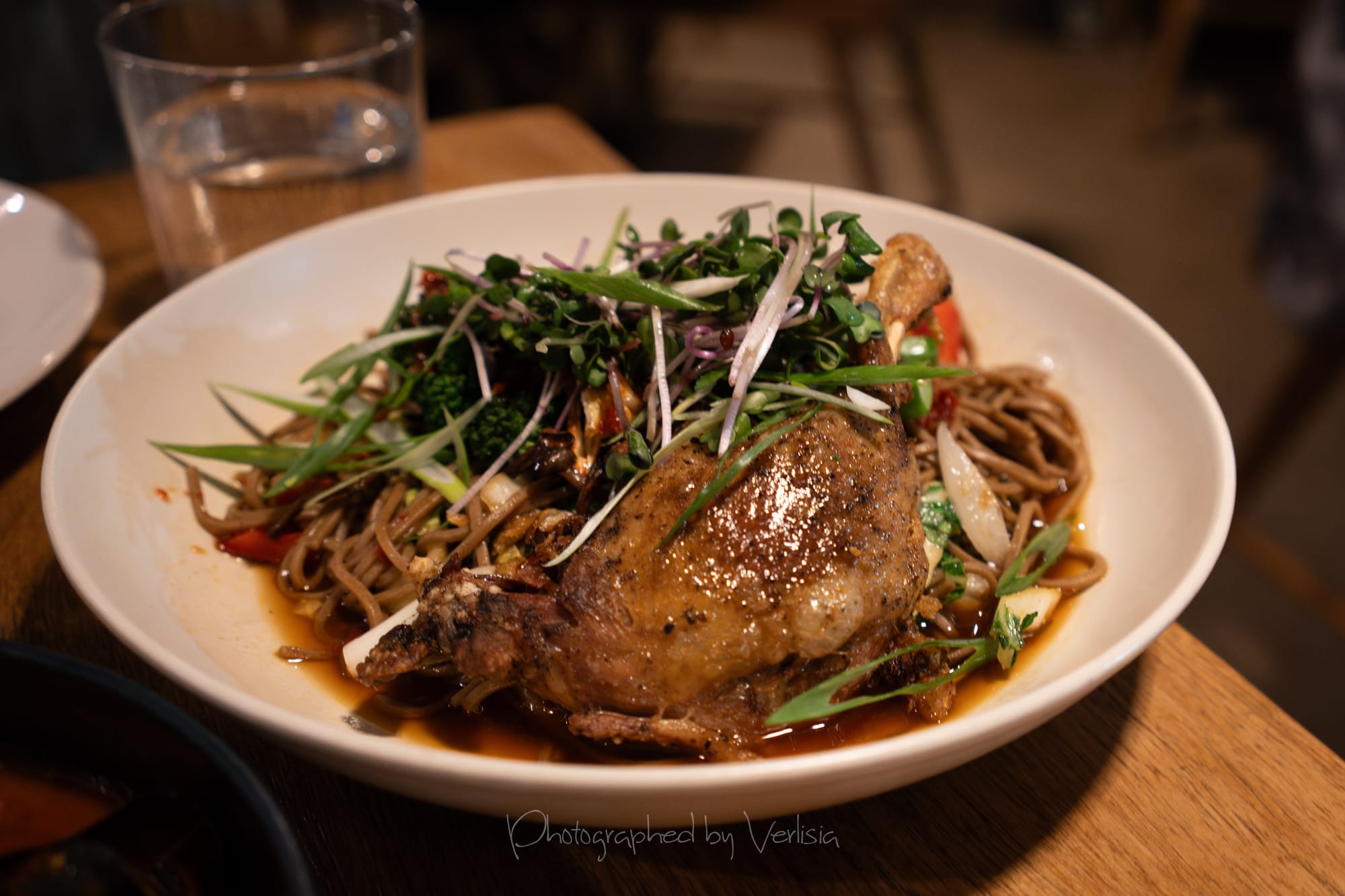 Warm Soba Noodles (soy-ginger vinaigrette, bok choy, sweet peppers, broccolini, wild mushrooms, sambal), Mocktail - Spicy Sunrise (Pineapple, orange, cilantro, jalapeno, lime, topo chico)
