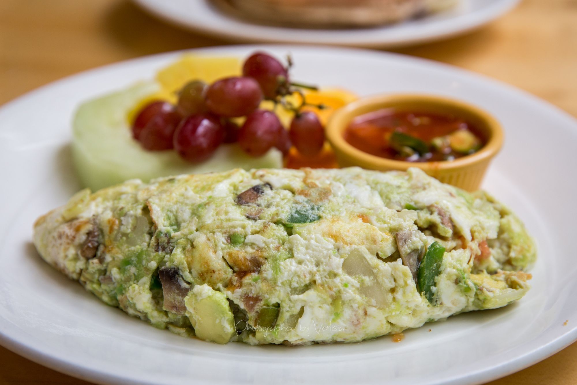 Banana-blueberry Crunch Cakes (Multigrain batter mixed with almond granola & blueberries, topped with bananas and honey), Iron Man (Egg-white omelet with mushrooms, avocado, tomatoes, onions and green peppers. Served with a side of salsa)