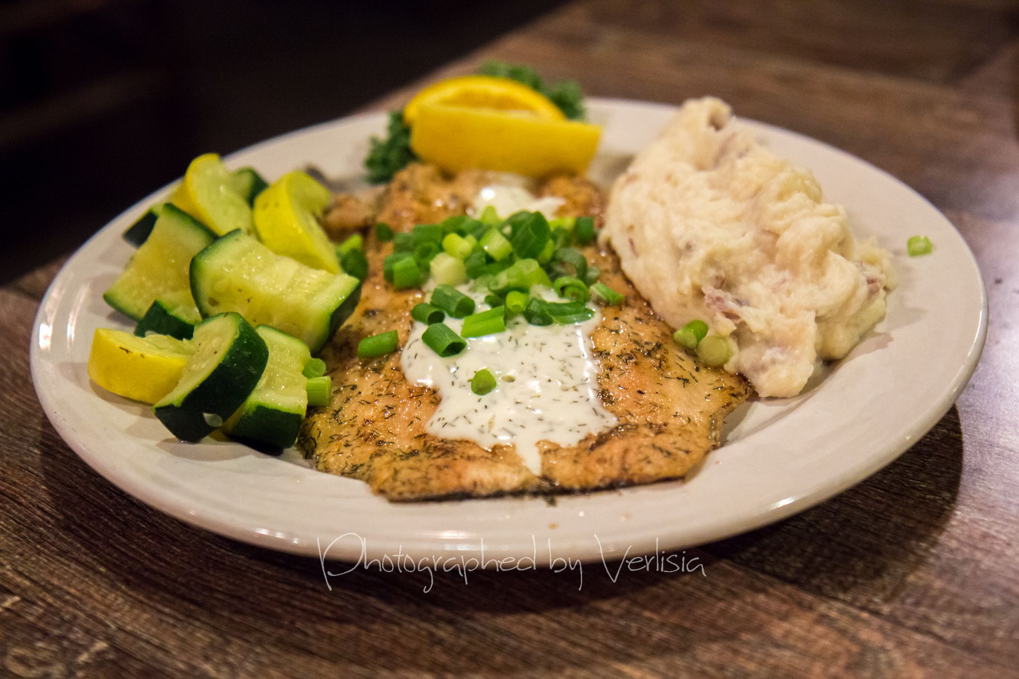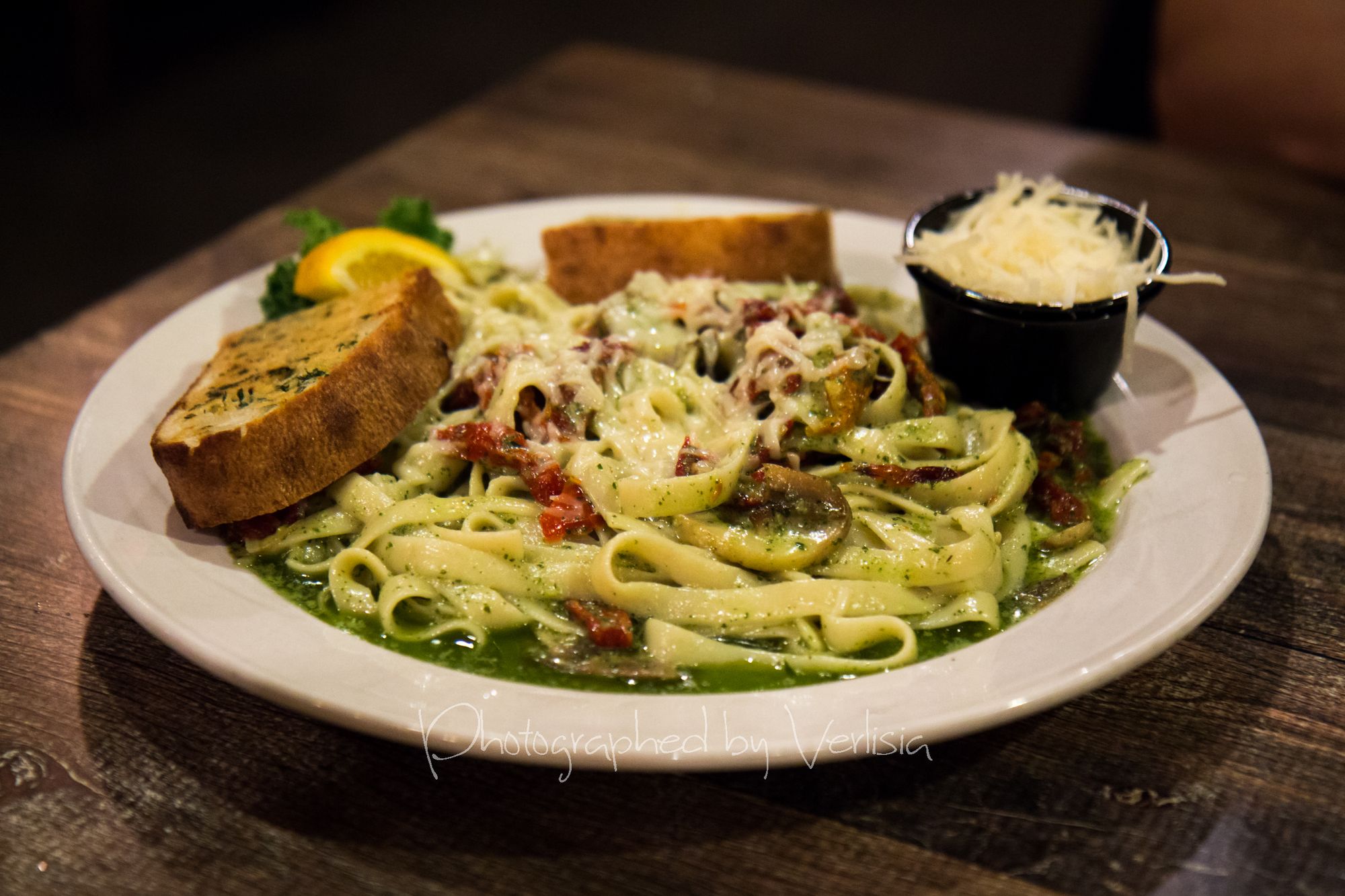 Pesto Fettuccine (Basil sauce with sauteed mushrooms and sun-dried tomatoes), Rainbow Trout (Farm raised whole body fish, grilled & served with garlic dill sauce)