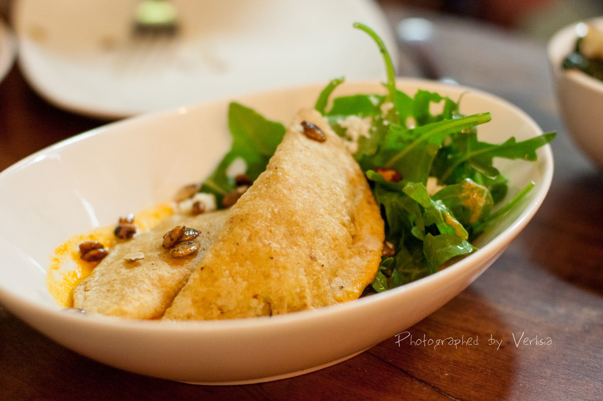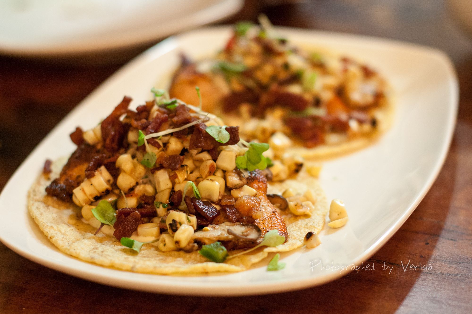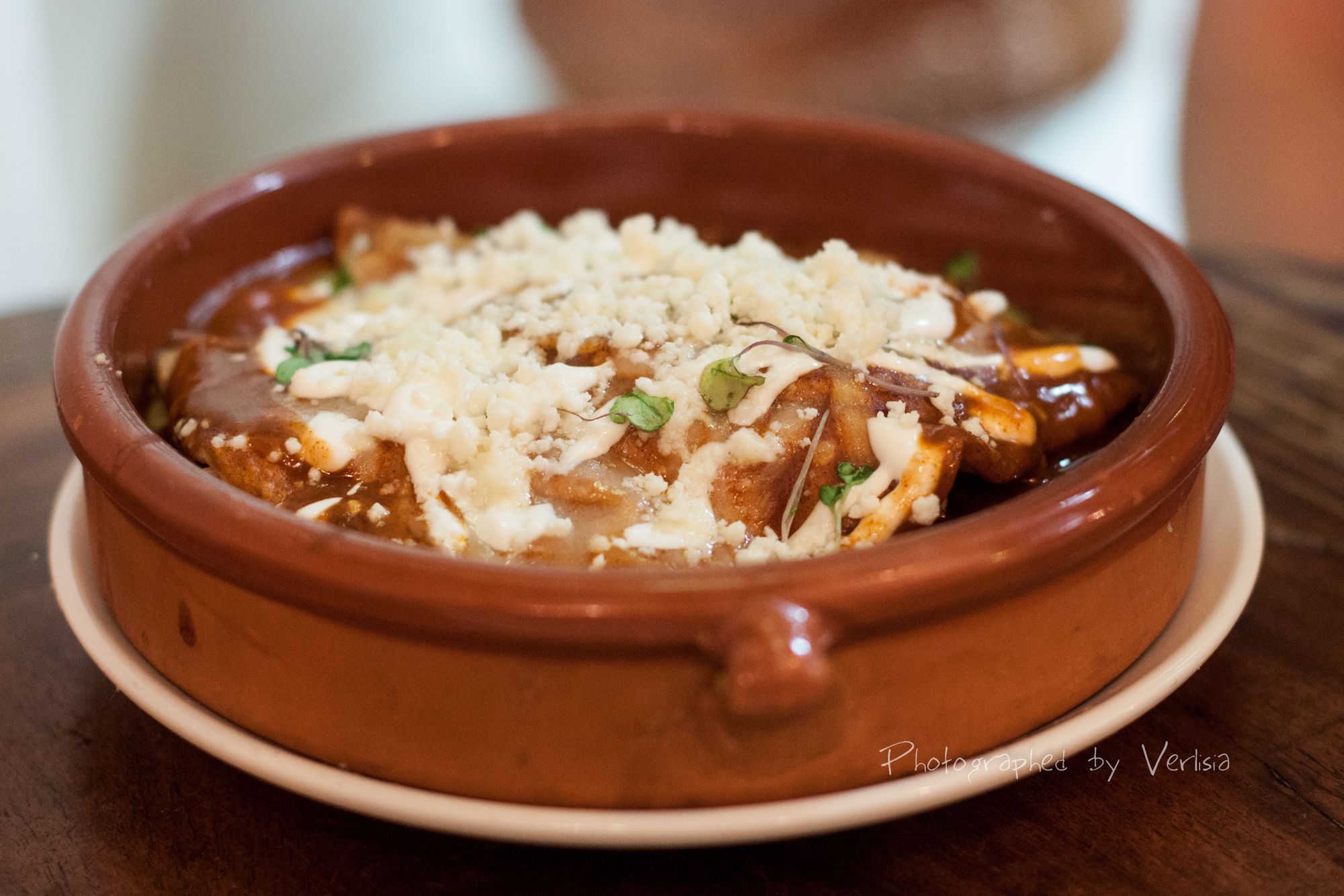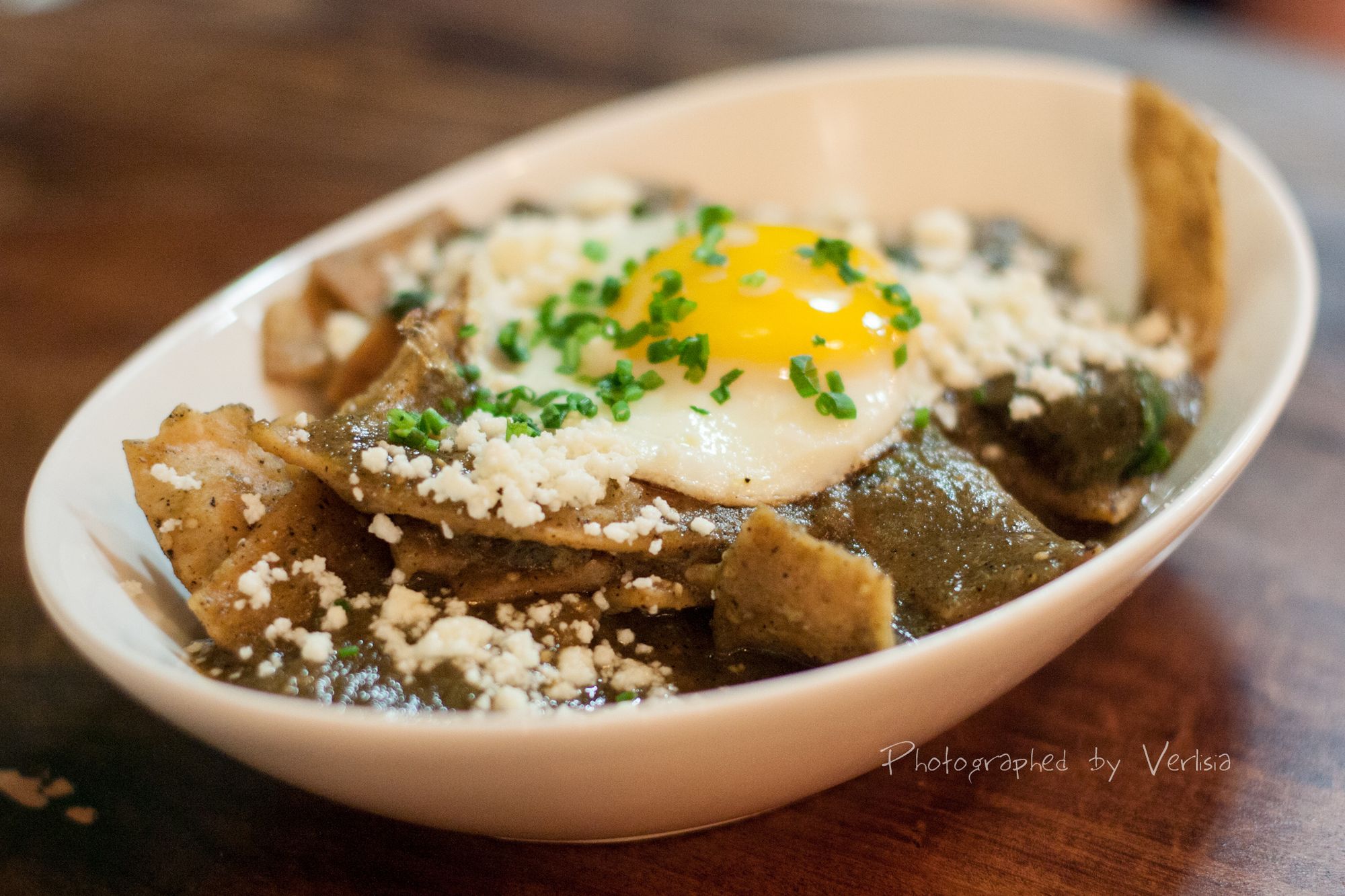 Water Jar, Summer Cooler, Chilaquiles (House made tortilla chips, tomatillo sauce, grilled onions, spinach, queso fresco, ranch gordo heirloom black bean puree, fried egg on top)Enchiladas de Pollo (free range chicken, mole colorado, queso fresco - served street style), Pan-Fried Potatoes + Roasted Poblano Peppers, Rancho Gardo Heirloom Pinto Beans + Crispy Bacon & Niman Ranch Skirt SteakQuesadillas (Ricotta Cheese, Roasted Poblano Pepper, Pepitas, Epazote inside 2 house-made corn tortillas - served on fresh greens with tomato jalapeno crema), Tacos de Salmon (king salmon filet blackened, corn tornto relish, jalapeno, red onion, shiitake mushrooms, cilantro aioli, crispy bacon)Bunuelos de Calabaza (Pumpkin Fritters, cinnamon sugar dust with Ponrope dipping sauce Mexican egg nog)